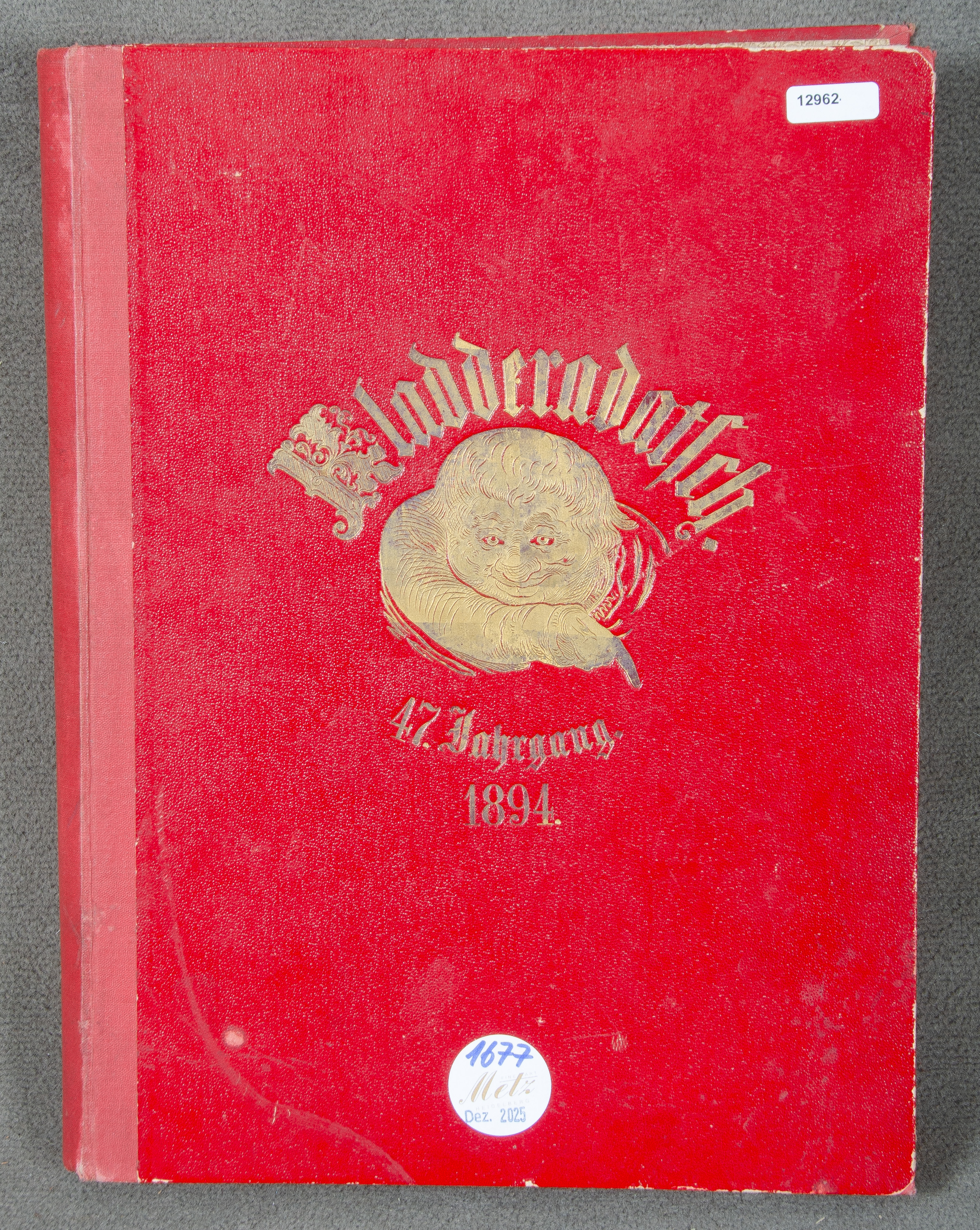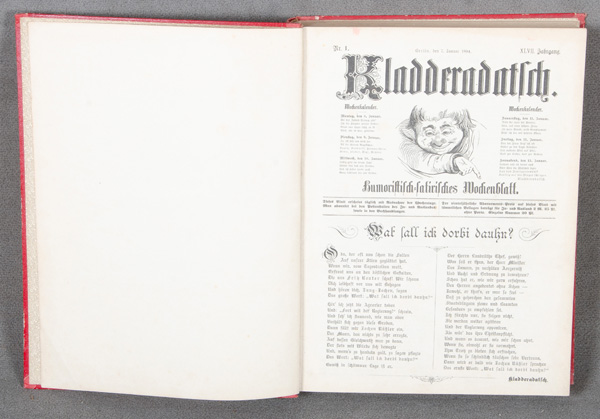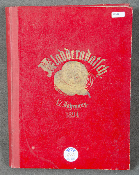 - Katalog-Nr: 1677„Kladderadatsch“, 47. Jg., vom 7. Januar 1894 bis zum 30. Dezember 1894, in gold geprägtem Lederband.o.L.