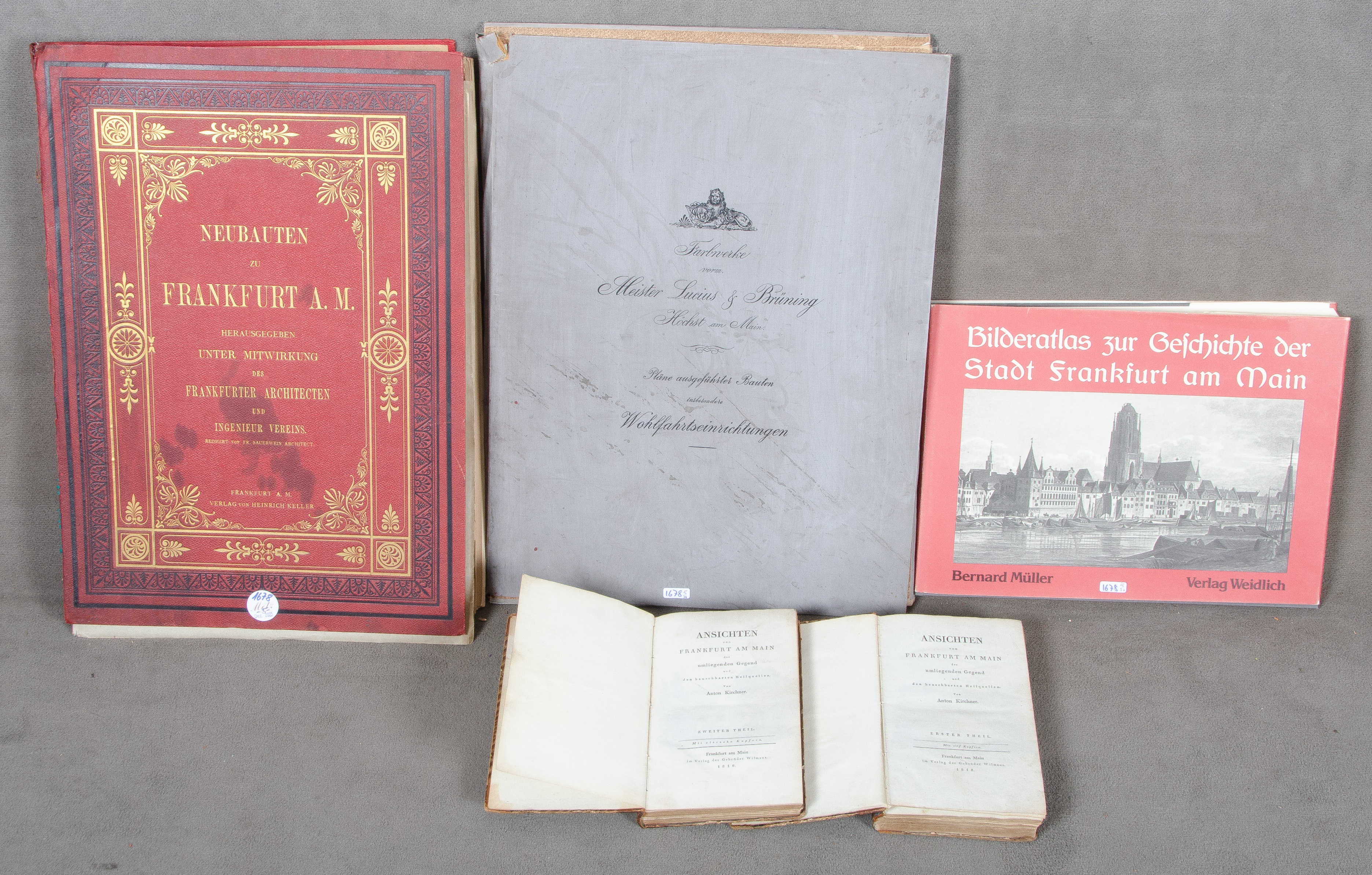 - Katalog-Nr: 1678Konvolut Bildbände / Literatur zu und über Frankfurt a./M., u.a. Anton Kirchner „Ansichten von Frankfurt am Main und seiner Umgegend“, zwei Bde., Gebr. Wilmans, Frankfurt 1818; Fr. Sauerwein (Hrsg), „Neubauten in Frankfurt“, erste Lieferung, Verlag Heinrich Keller, Frankfurt 1884; Bernhard Müller, „Bilderatlas zur Geschichte der Stadt Frankfurt“, Verlag Weidlich 1976.o.L.