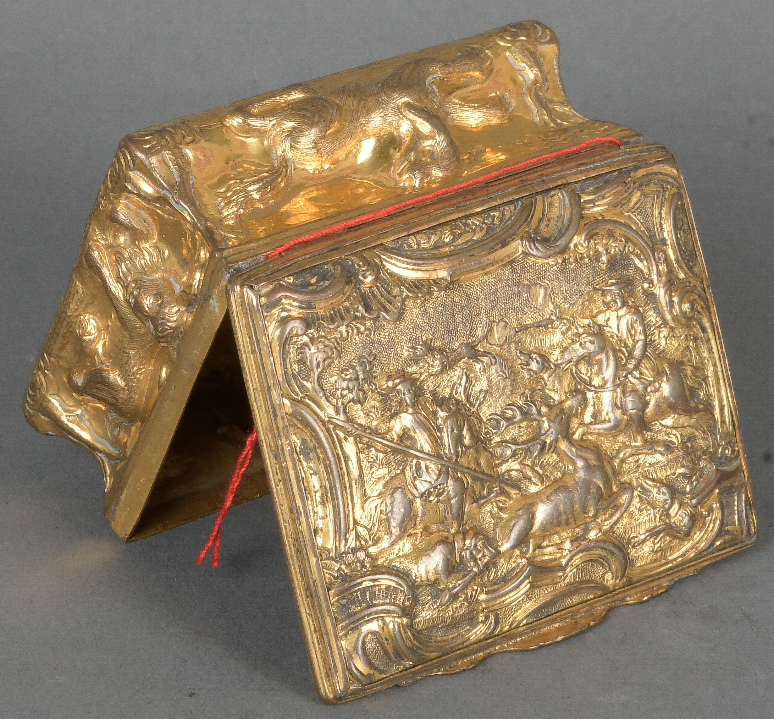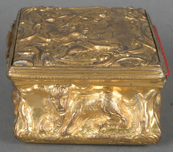 - Katalog-Nr: 1681Jagdtabatière. Deutsch um 1750. Feuervergoldetes Kupfer, reich reliefiert mit Jagddarstellungen, teilw. ziseliert, H=3,5 cm, B=7,3 cm, T=5,8 cm.o.L.