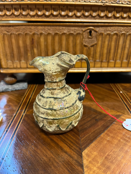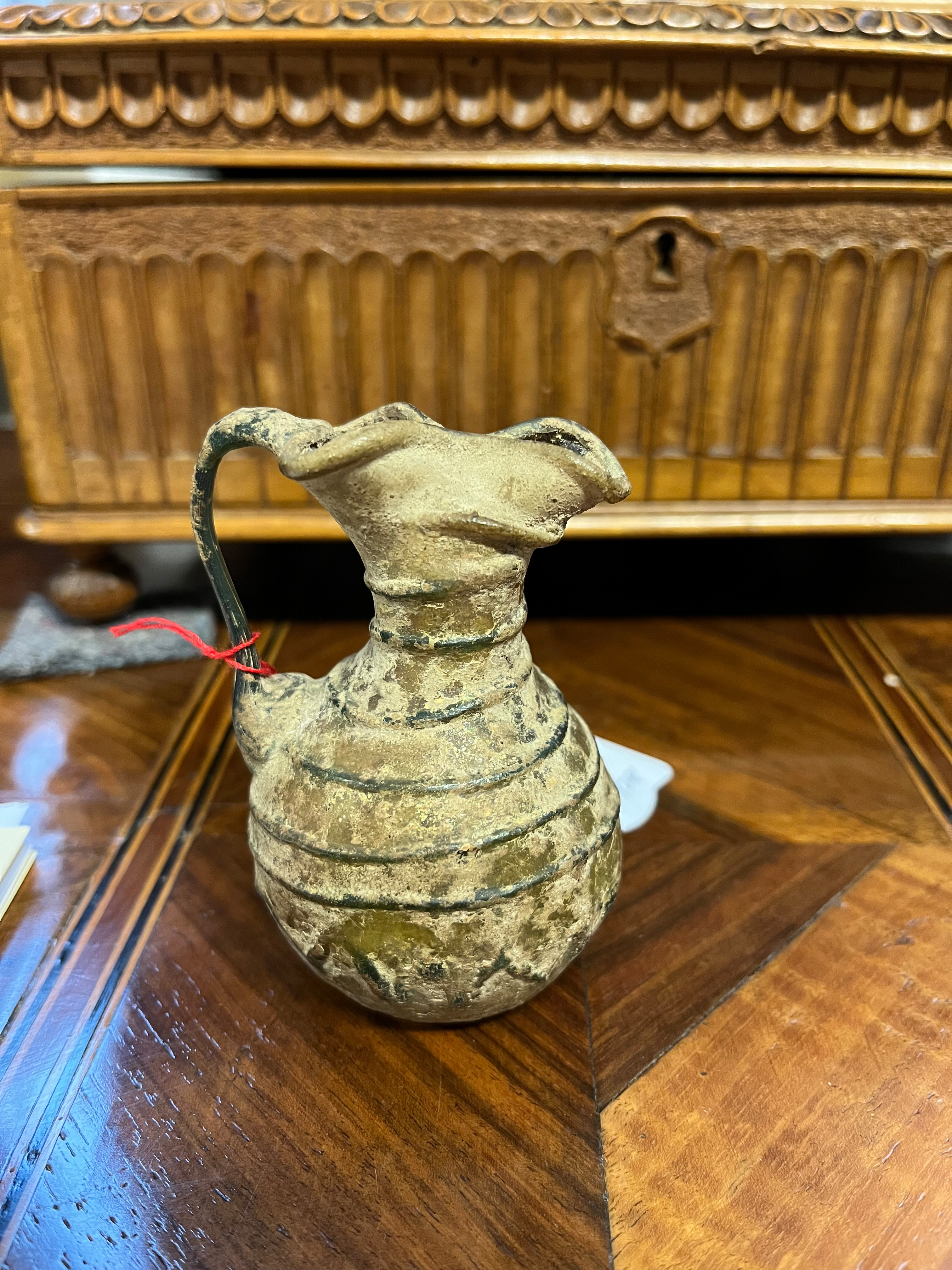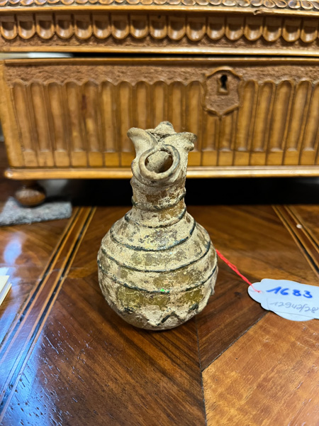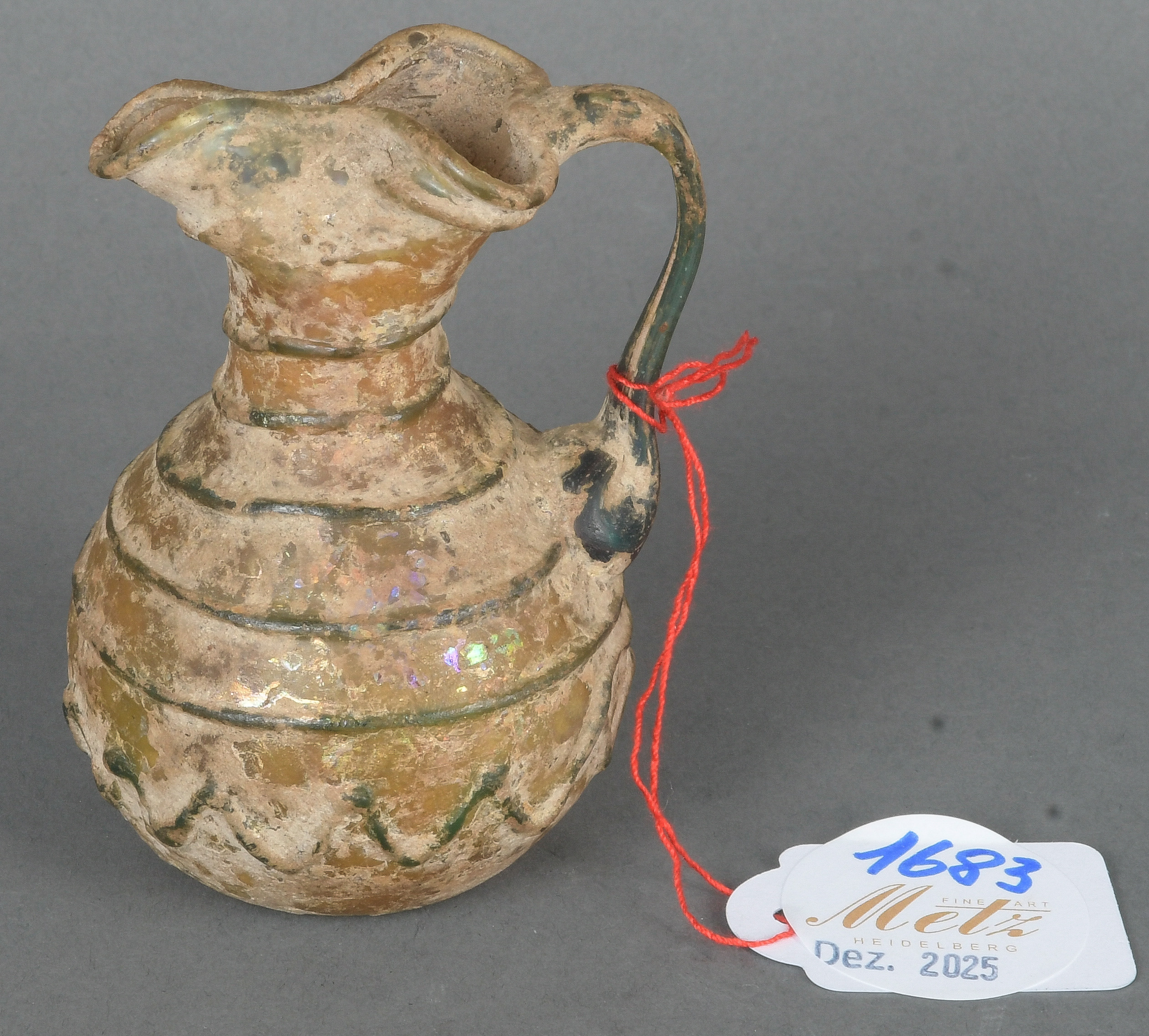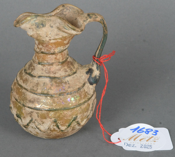 - Katalog-Nr: 1683Henkelkrüglein. Römisch. Glas mit Erdkruste, H=8,4 cm.o.L.