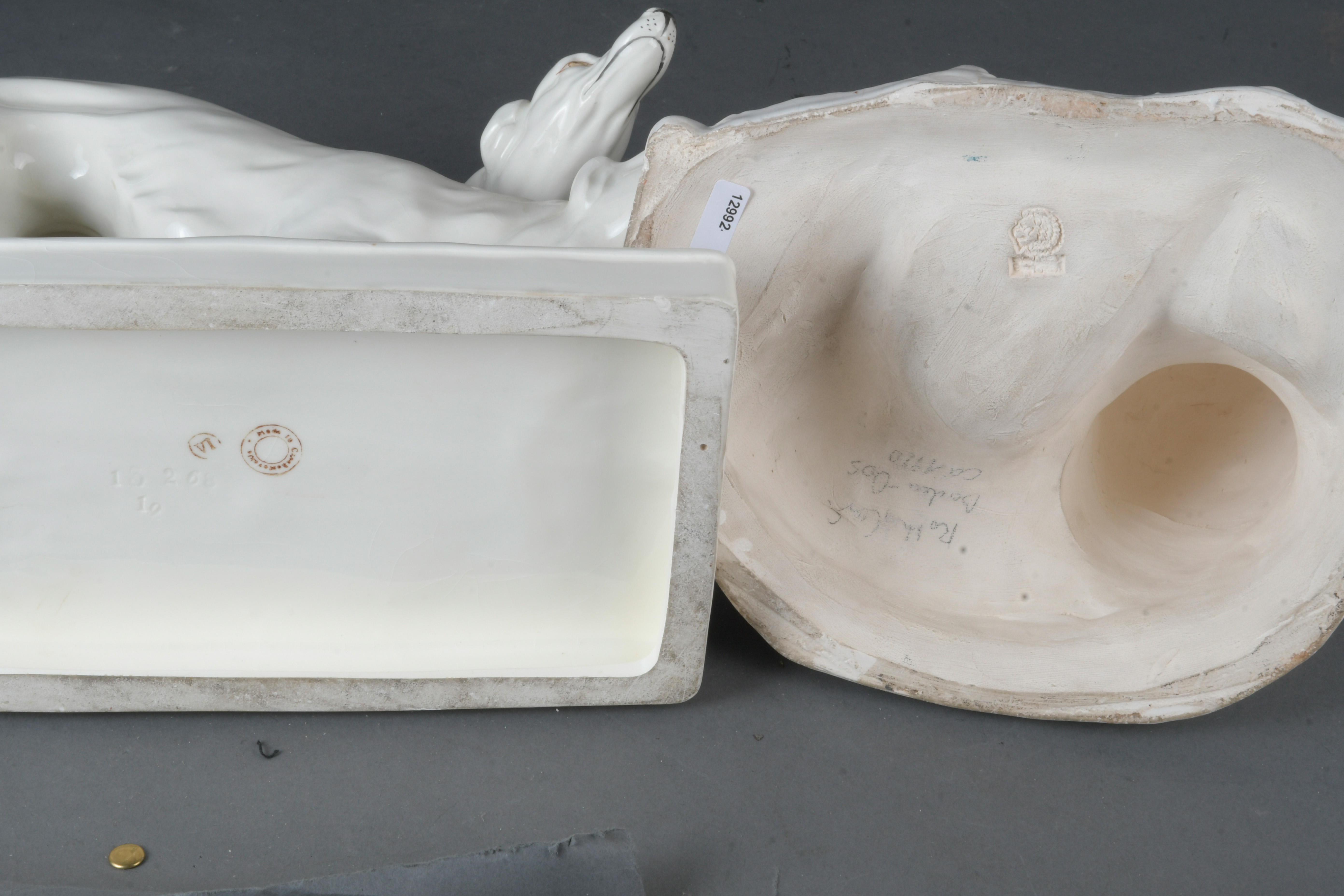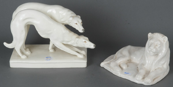 - Katalog-Nr: 1685Windhundpaar und Löwe, u.a. Baden-Oos 20. Jh. Feinsteinzeug / Irdengut, crèmefarben glasiert; teilw. am Boden gemarkt, Entwurf wohl Carl Roth, H=13 / 19,5 cm.o.L.