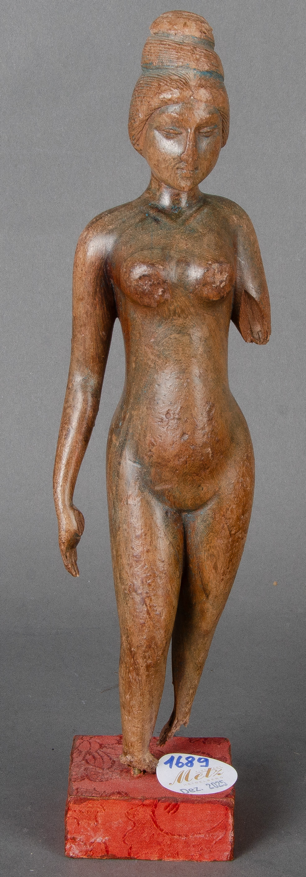 - Katalog-Nr: 1689Stehender Frauenakt. Massivholz, geschnitzt, auf neuzeitlich stoffbezogenem Sockel, H=27,5 / 30 cm. (besch.)o.L.