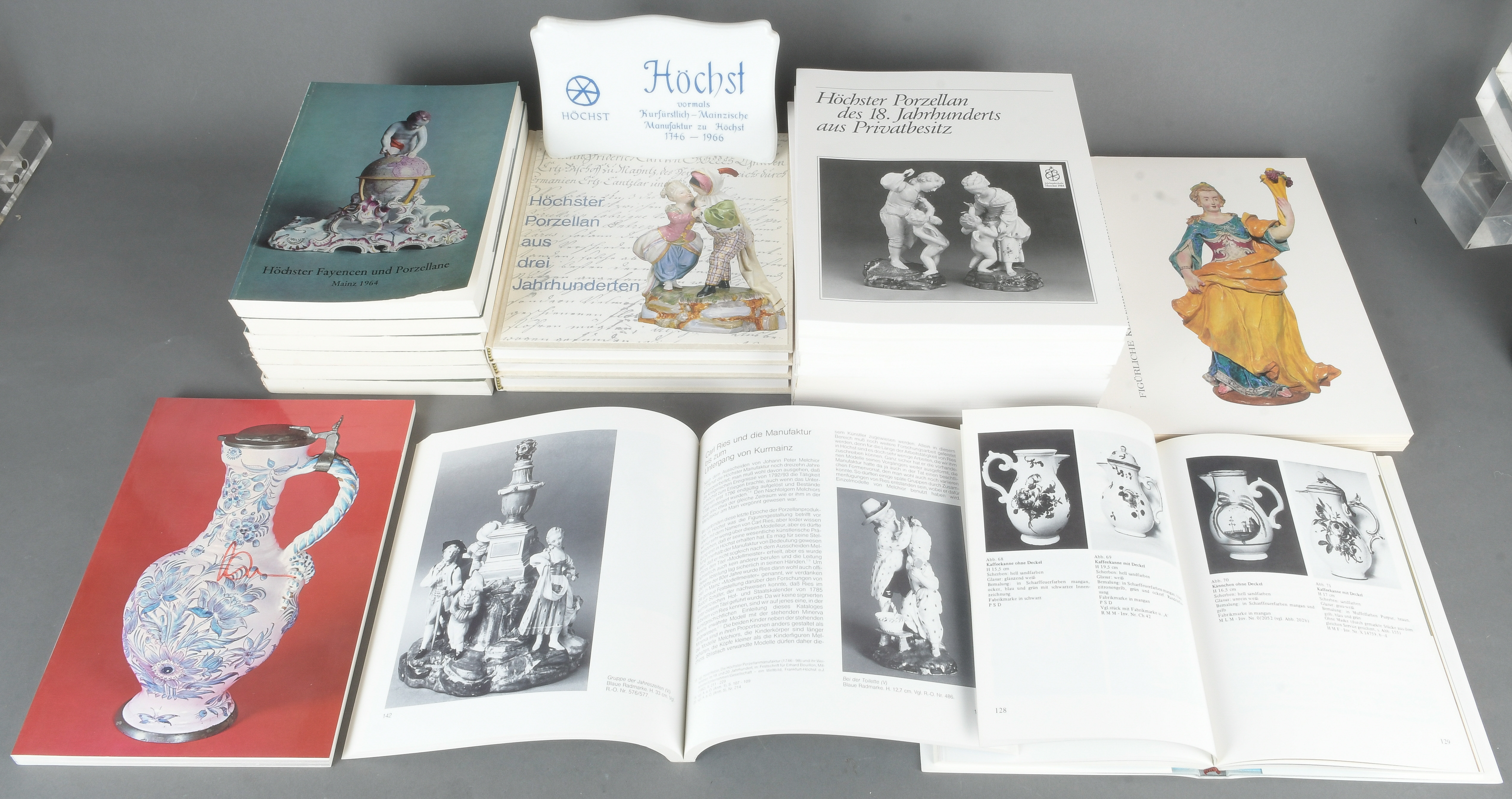 - Katalog-Nr: 1693Konvolut Literatur über Höchster Porzellan, u.a. Ausstellungskatalog „Höchster Porzellan in Privatbesitz“, 1984/85 (acht Expl.); Horst Reber, „Höchster Porzellan aus drei Jahrhunderten“ (vier Expl.) und ders. „Höchster Fayence und Porzellan“, Mainz 1964 (sechs Expl.).o.L.