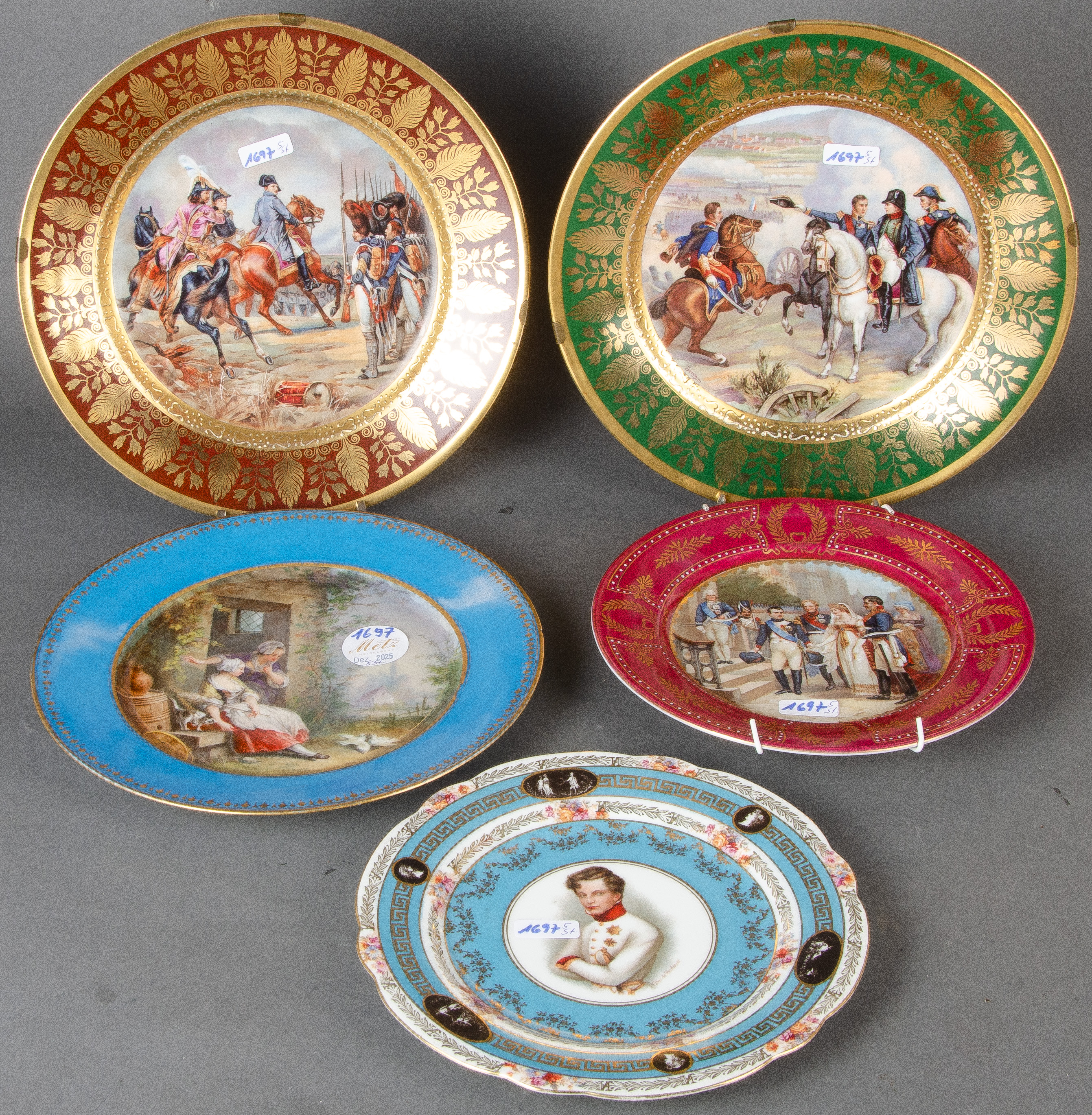 - Katalog-Nr: 1697Fünf Teller. Frankreich 19. Jh. und später. Porzellan, unterschiedlich farbig dekoriert mit Porträt, Bataillenszene mit Napoleon, zwei Mägden mit Taube, re./u./sign. „Henri Poitevin 1887“, D=19,5 bis 24,5 cm.o.L.