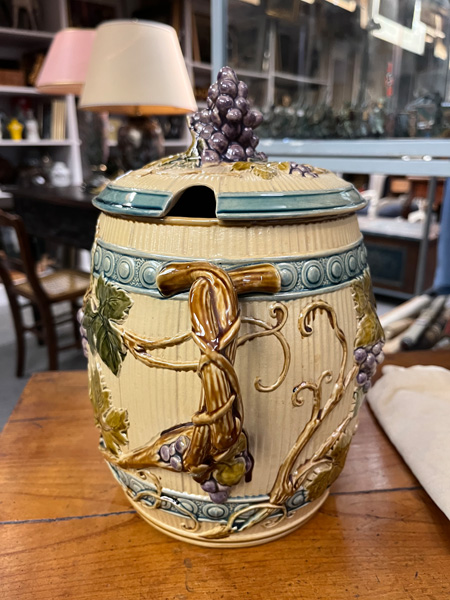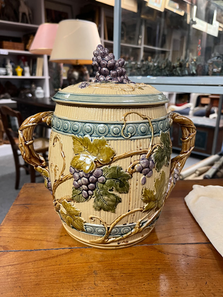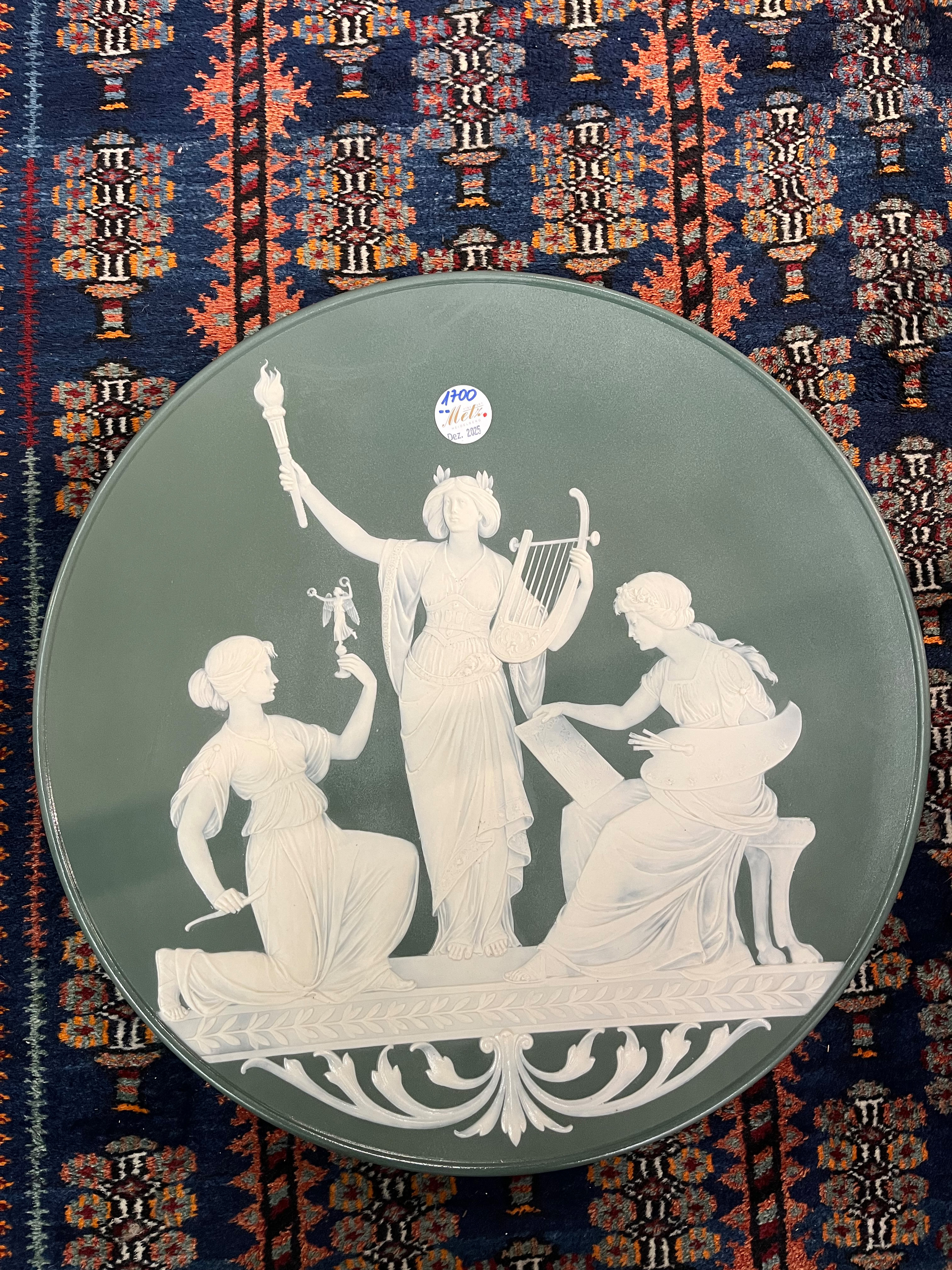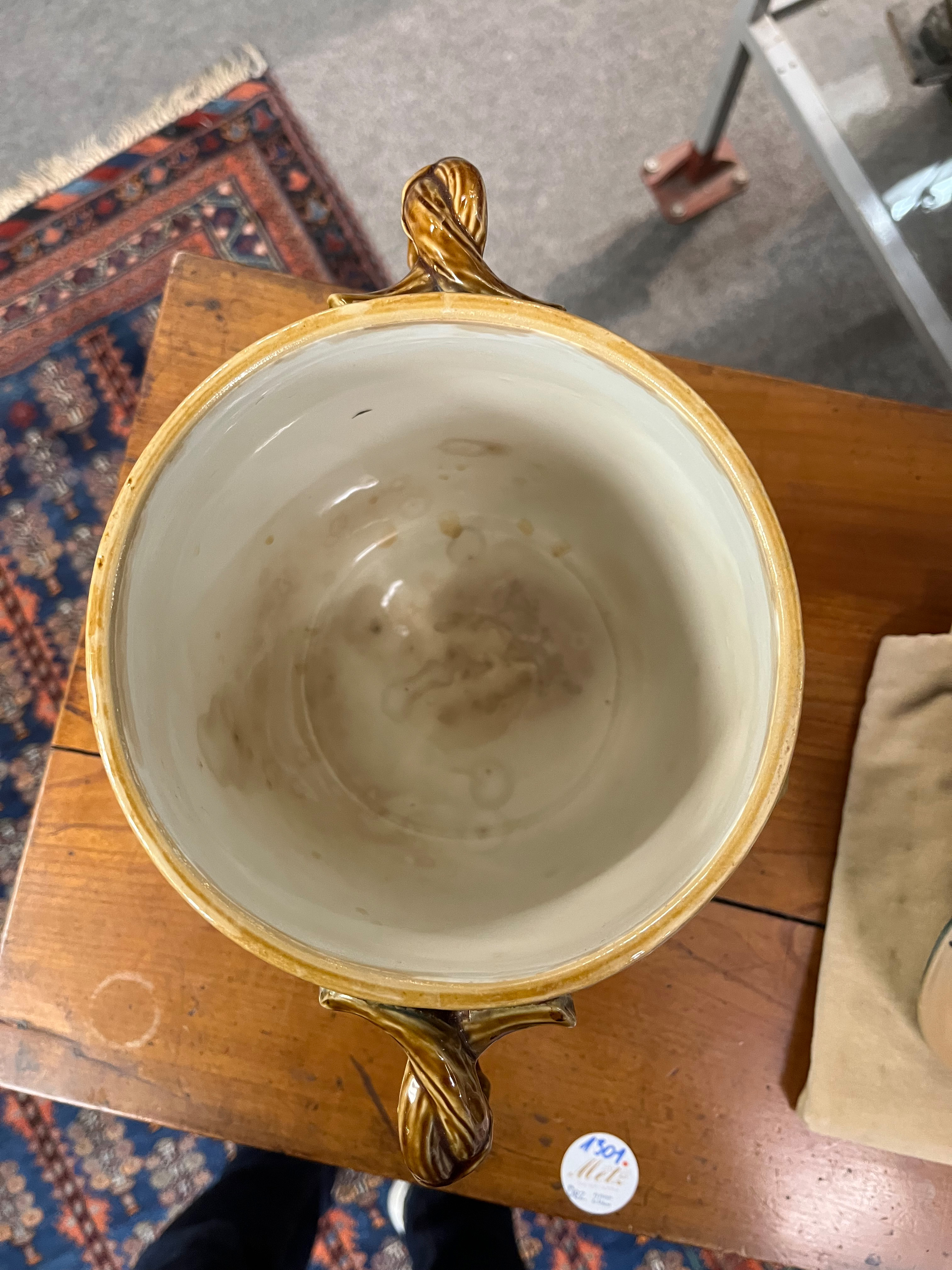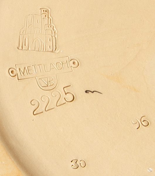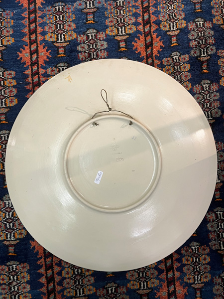 - Katalog-Nr: 1700Große Prunkplatte und Bowletopf. Mettlach 19./20. Jh. Feinsteinzeug, reliefiert und bemalt; am Boden gemarkt, D=44,5 cm / H=28 cm.o.L.