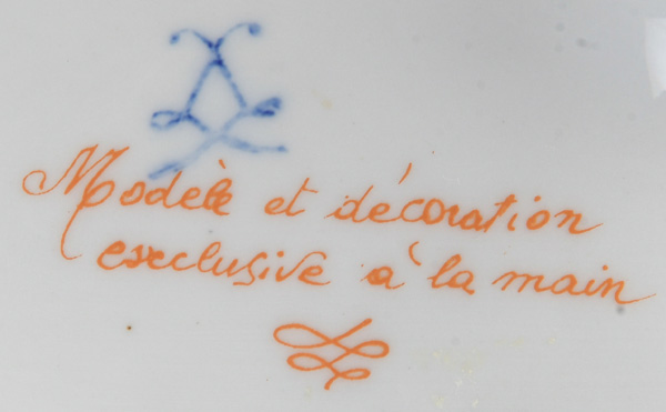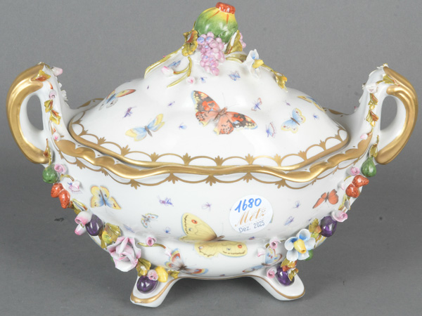 - Katalog-Nr: 1680Ovale Prunkterrine. Sèvresstil 20. Jh. Porzellan, mit aufbossierten Blüten und Früchten, Freiräume bunt bemalt mit Insekten, H=21 cm, B=30 cm, T=16,5 cm. (min. best.)o.L.