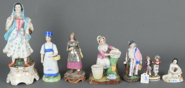 - Katalog-Nr: 1682Sieben Figuren bzw. -gruppen. Böhmen 19. Jh. Porzellan, bunt bemalt, H=6,8 bis 24,6 cm. (teilw. besch.)o.L.