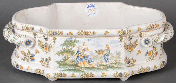 - Katalog-Nr: 1686Ovale Schale. Frankreich 19. Jh. Fayence, bunt bemalt mit Floraldekor, Landschaften und Personenstaffage; verso gemarkt, H=11,5 cm, B=33 cm, T=17,5 cm. (besch. / rest.)o.L.