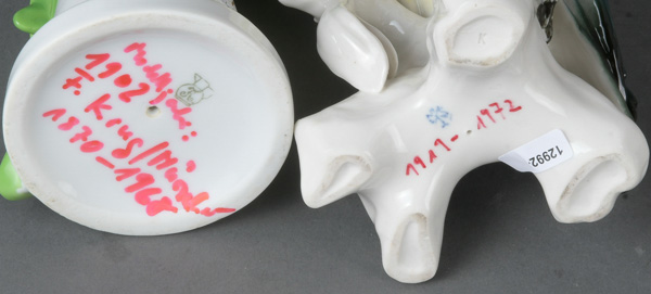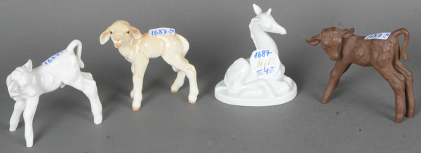 - Katalog-Nr: 1687Giraffe, Lamm und zwei Kälbchen, u.a. Meissen / Rosenthal 20. Jh. Porzellan, bunt bemalt / Böttgersteinzeug, am Boden gemarkt, u.a. Entwurf von Willi Münch-Khé, H=8 bis 9,5 cm.o.L.