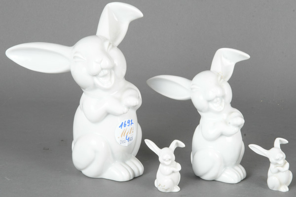 - Katalog-Nr: 1692Vier Hasen. Rosenthal 20. Jh. Porzellan, weiß glasiert; am Boden gemarkt, Entwurf von Max Fritz, H=4,6 bis 18 cm.o.L.