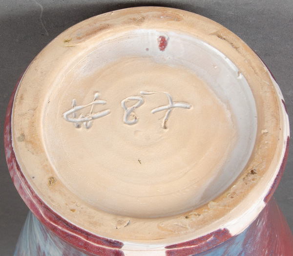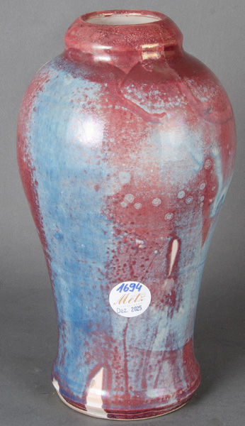 - Katalog-Nr: 1694Vase. Deutsch dat. (19)87. Künstlerkeramik mit Blei- und Laufglasur; am Boden ligiert monogr. „CW“ bzw. „MC“, H=27,5 cm.o.L.