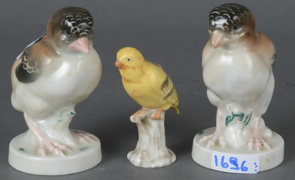 - Katalog-Nr: 1696Zwei Küken und Kanarienvogel, u.a. Volkstedt-Ens 20. Jh. Porzellan, bunt bemalt; am Boden gemarkt, H=6,3 bis 8,4 cm. (eine besch.)o.L.