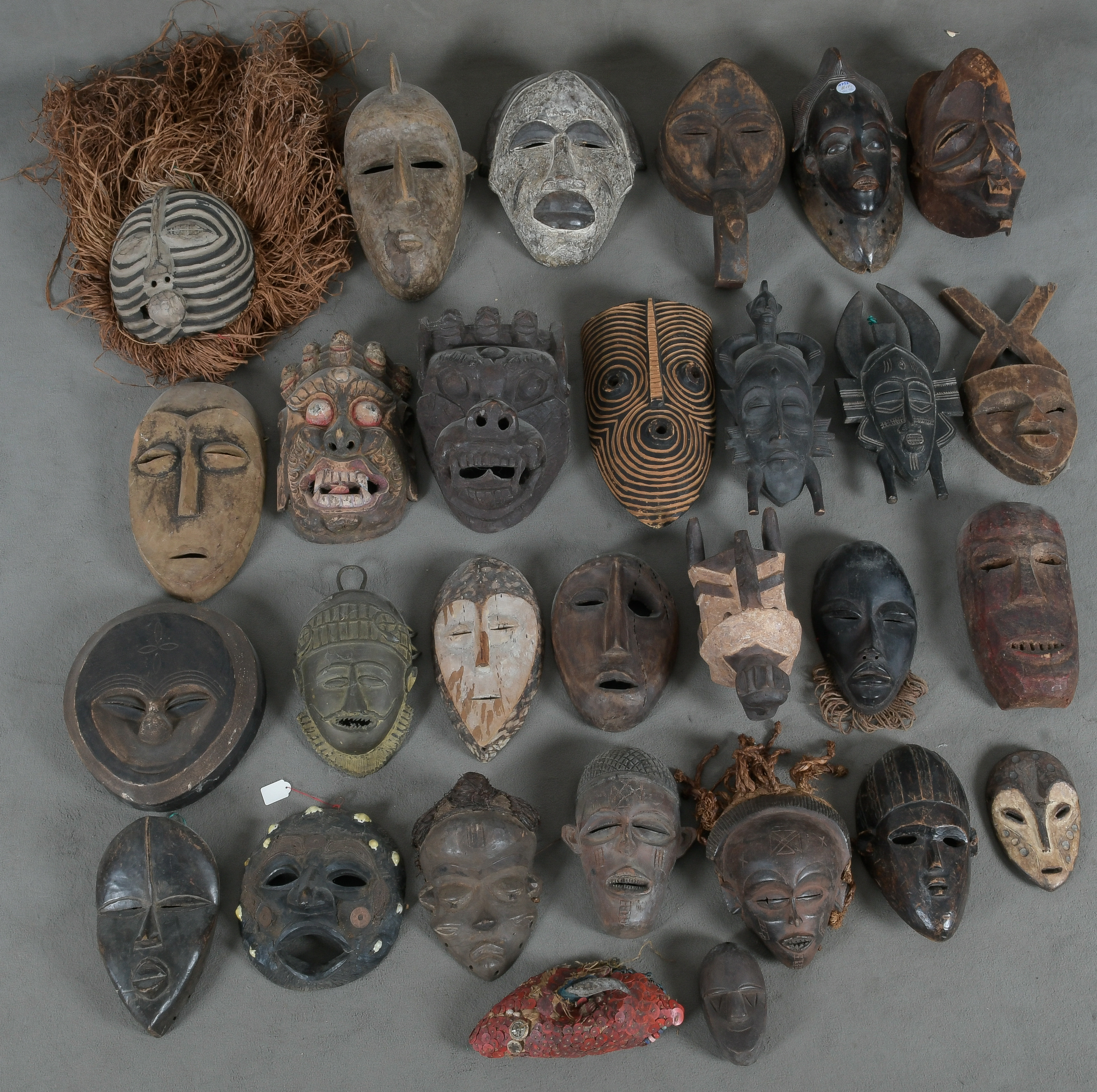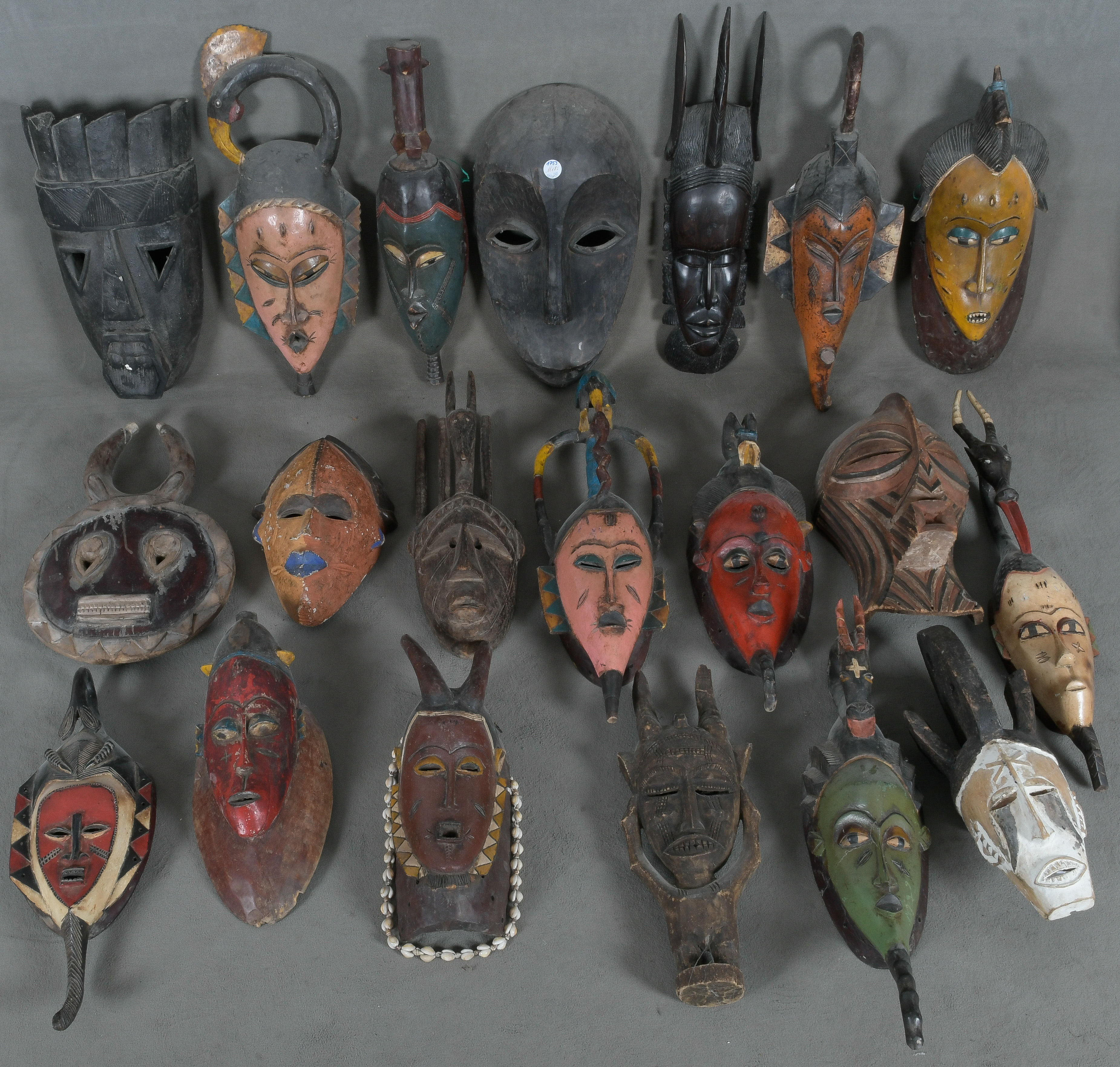 - Katalog-Nr: 1752Konvolut Kultmasken. Afrika. Massivholz, geschnitzt und teilw. bemalt, H=15 bis 38 cm.o.L.