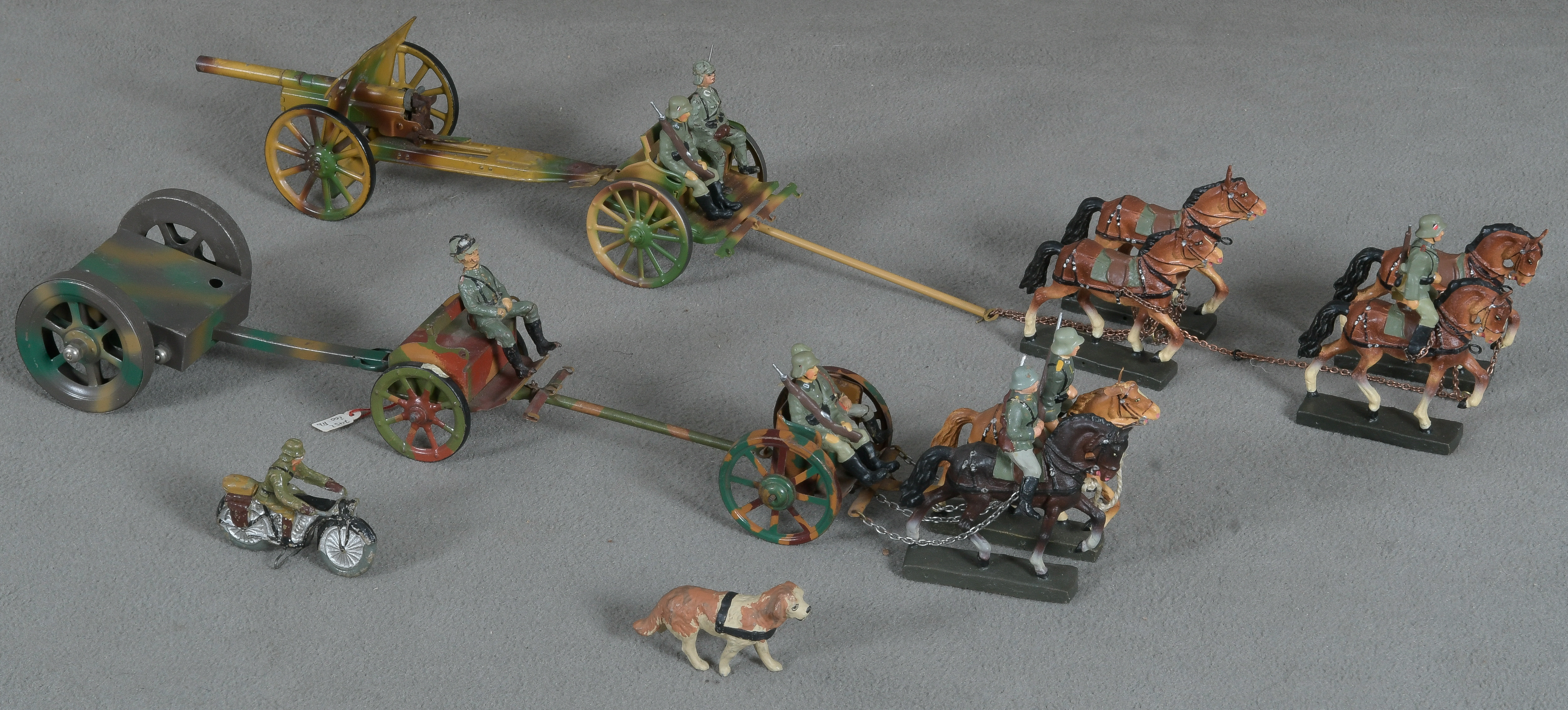 - Katalog-Nr: 1758Feldartillerie und Fahrzeuge. Deutsch 20. Jh. Blech, bemalt / Elastolin, H=4 bis 8 cm. Dazu ein Hund und ein Motorradfahrer.o.L.