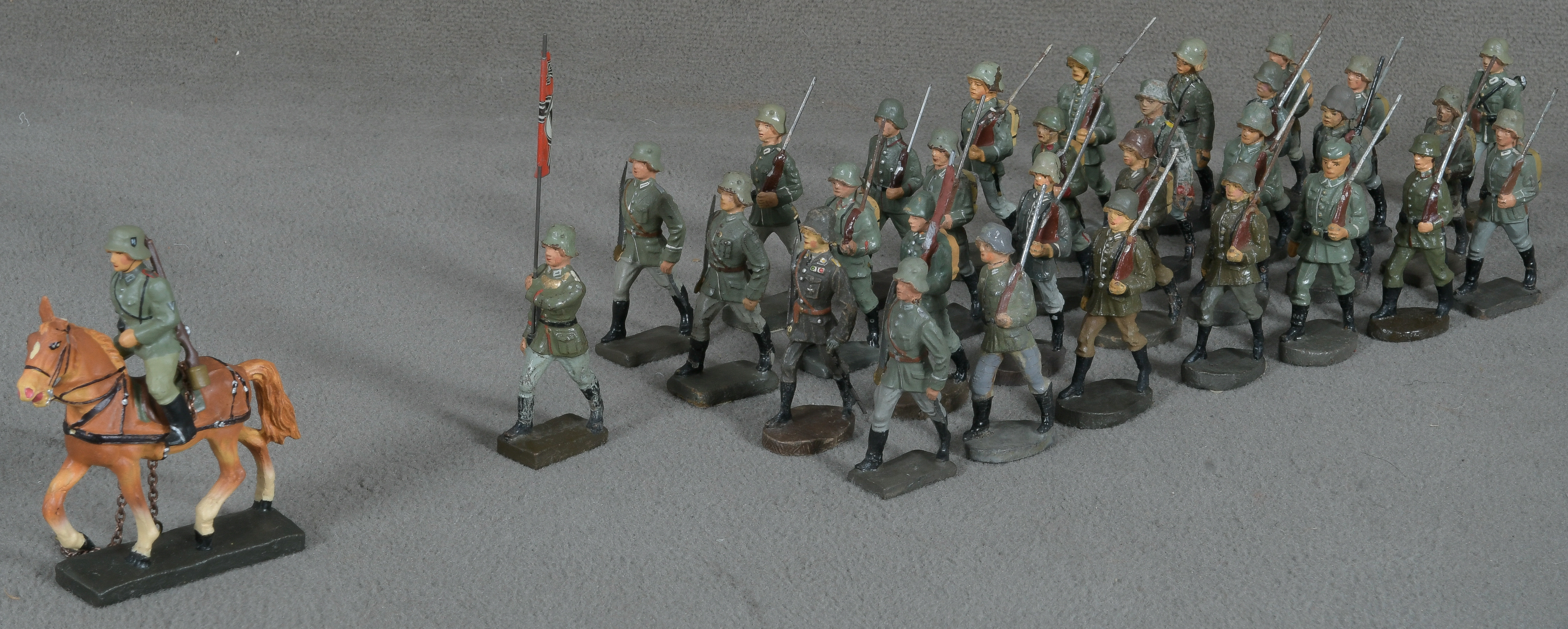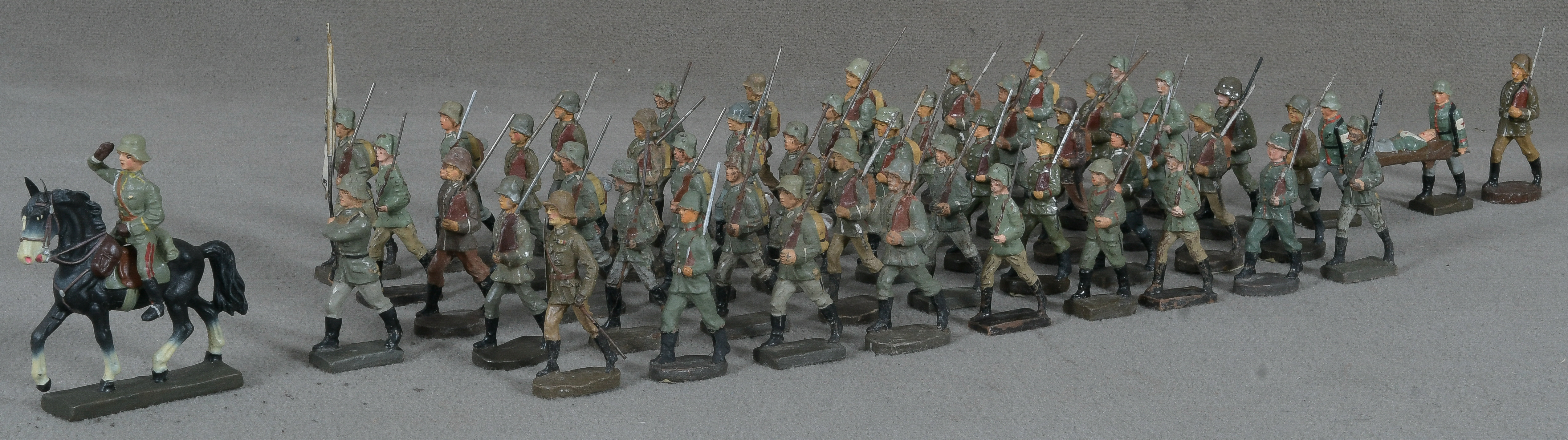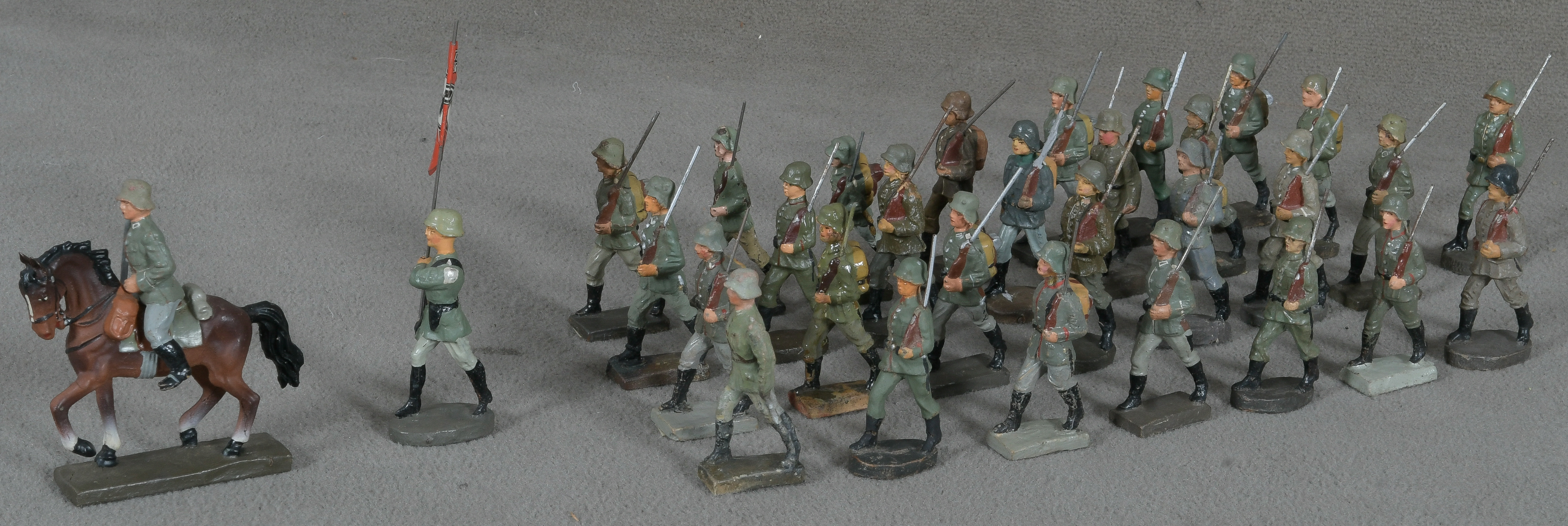 - Katalog-Nr: 176331-tlgs. Konvolut Spielzeug-Soldaten der Infanterie II. WK. Deutsch 20. Jh. Elastolin, H=7 bis 13 cm. (teilw. besch.)o.L.
