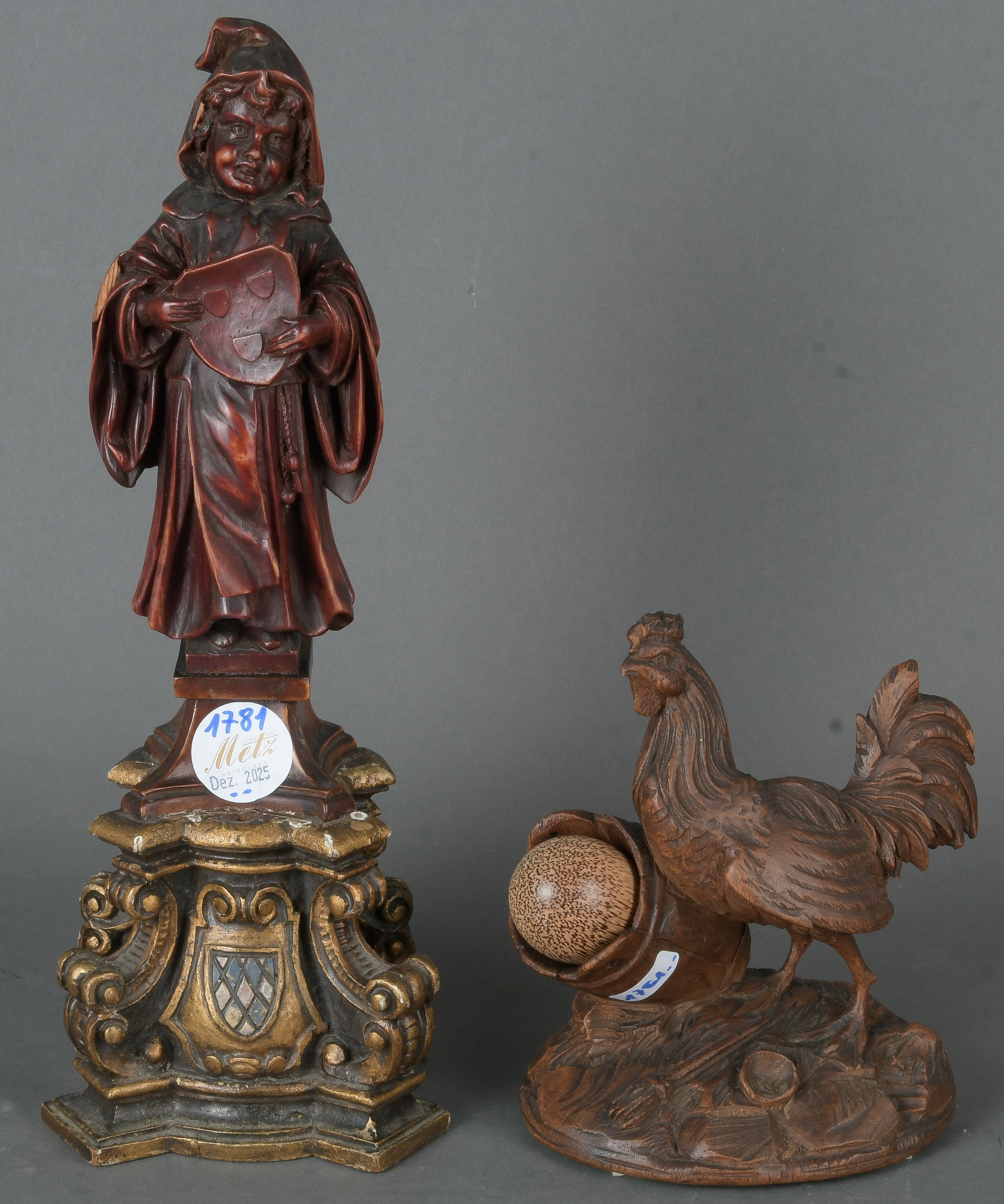 - Katalog-Nr: 1781Hahn und Münchner Kindl. Deutsch dat. 1922. Massivholz, geschnitzt, H=17 / 33 cm.o.L.