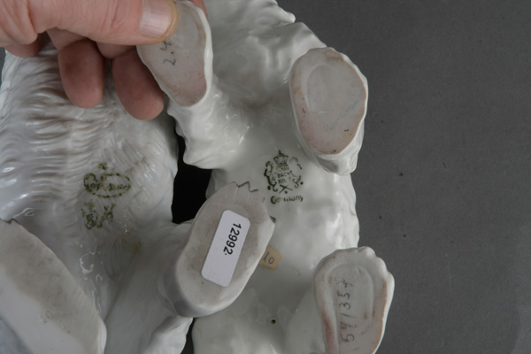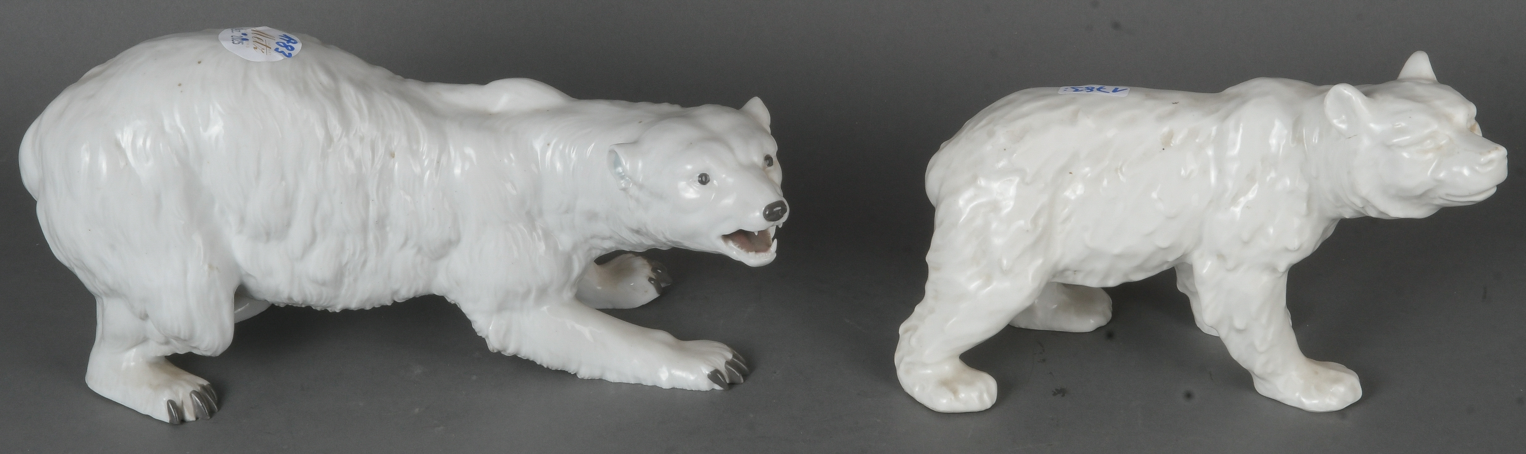 - Katalog-Nr: 1783Zwei Bären. Schaubach / wohl Thüringen 20. Jh. Porzellan, bunt bemalt; teilw. am Boden gemarkt, H=13 / 13,5 cm.o.L.