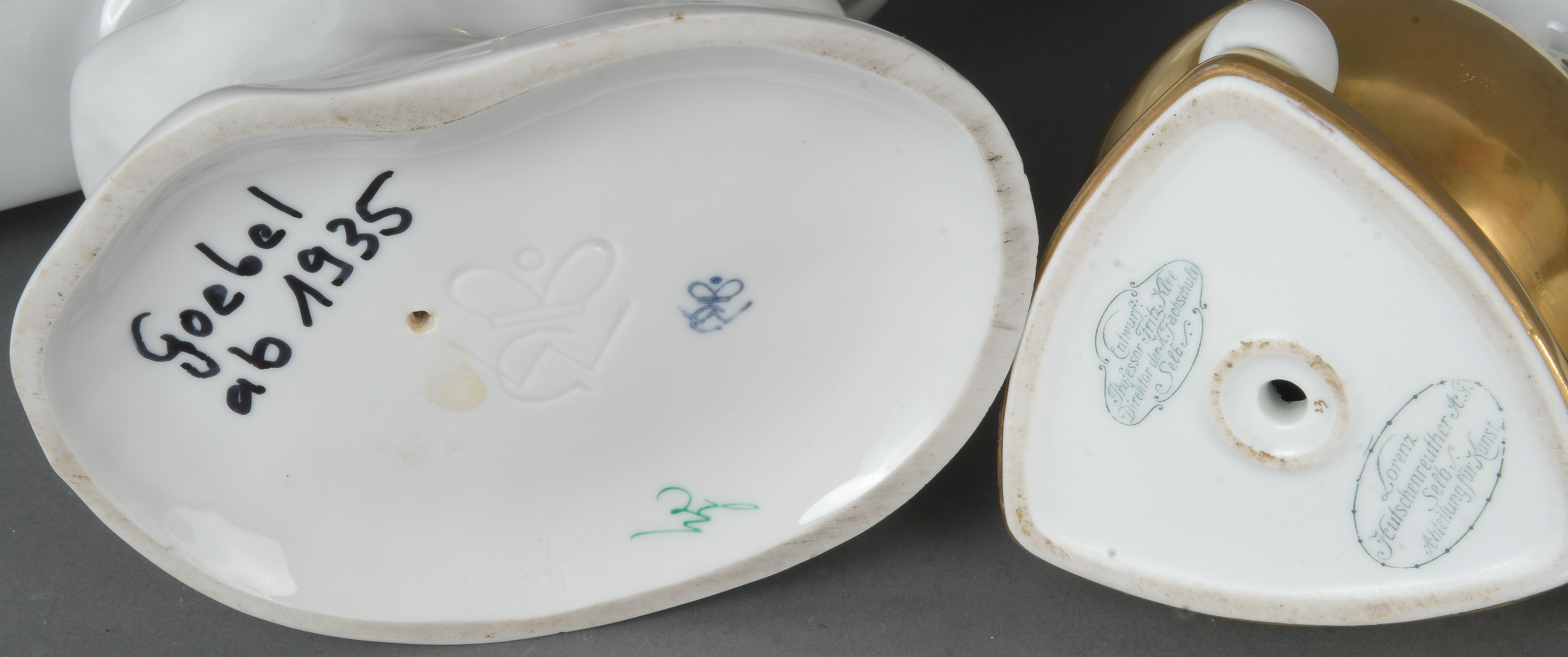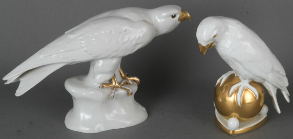 - Katalog-Nr: 1785Bussard und Papagei. Göbel / Hutschenreuther 20. Jh. Porzellan, weiß glasiert, teilw. gold staffiert; am Boden gemarkt, u.a. Entwurf und sign. Fritz Klee, H=19 / 20 cm.o.L.