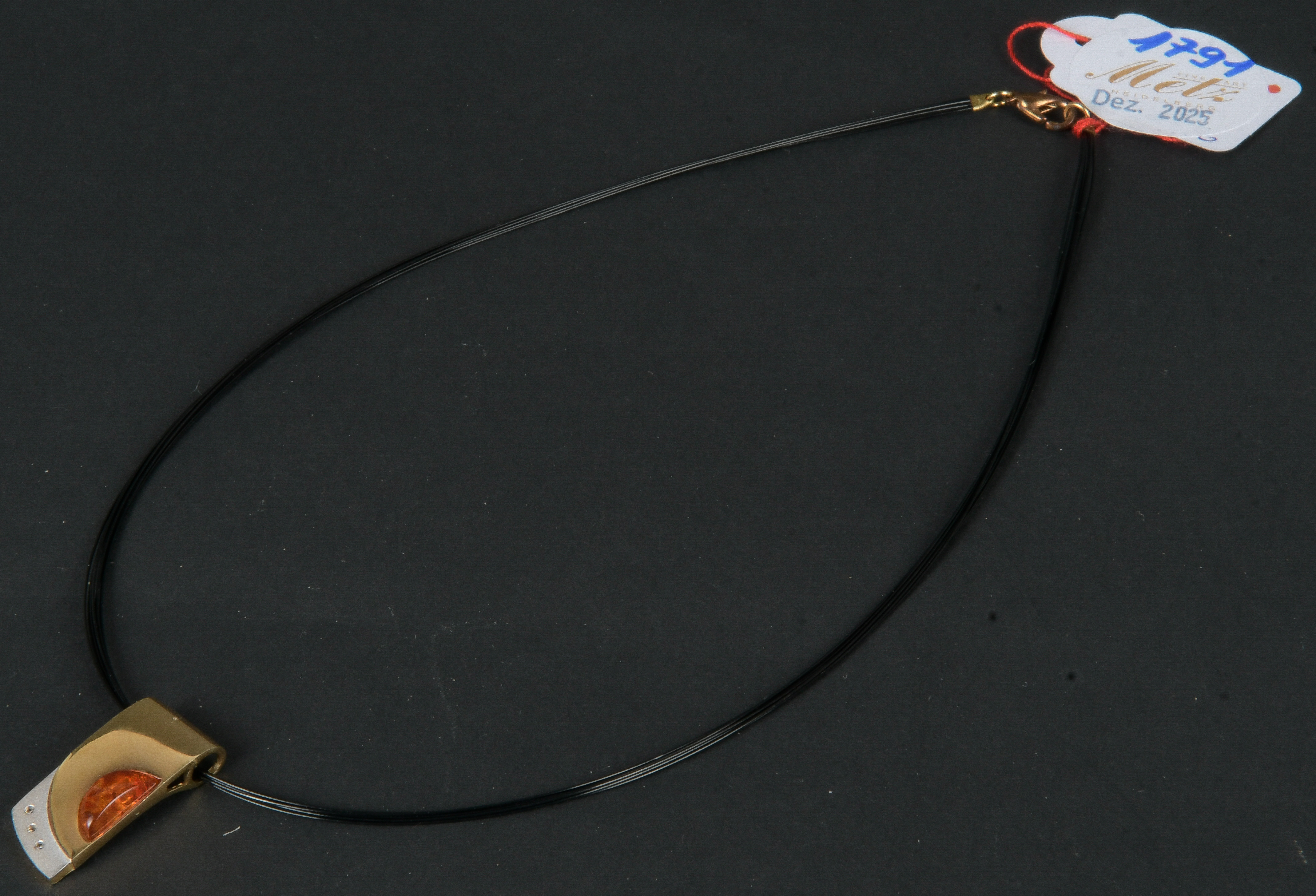- Katalog-Nr: 1791Designer-Anhänger und -Halskette. Vergoldet, besetzt mit Bernsteinen und Steinen, L=40 cm.o.L.