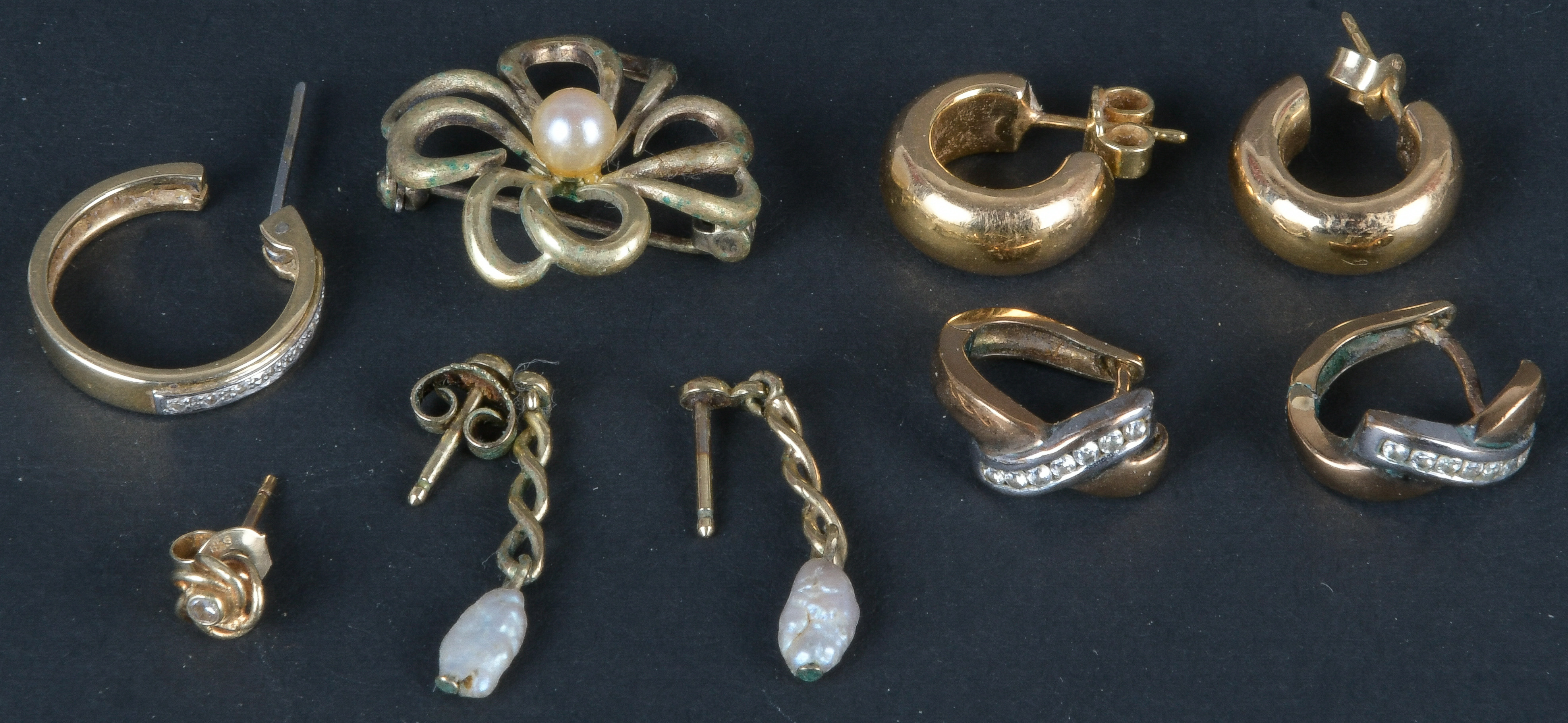 - Katalog-Nr: 1792Konvolut Schmuck: Drei Paar Ohrstecker und zwei einzelne. 14 kt Gold, Gesamtgewicht, ca. 5,21 g / 8 kt Gold, Gesamtgewicht ca. 4,24 g, teilw. besetzt mit Perlen sowie eine vergoldete Brosche.o.L.