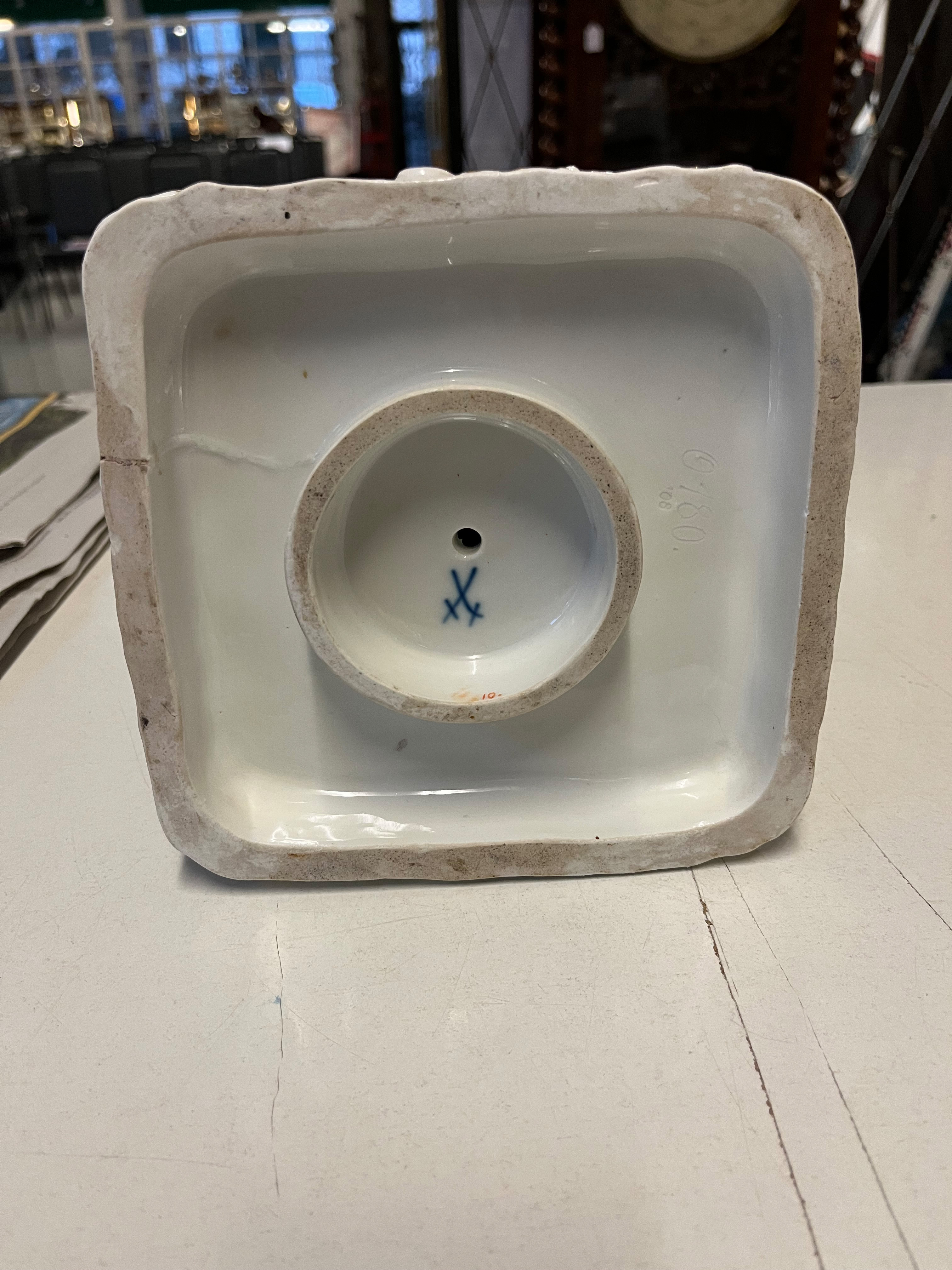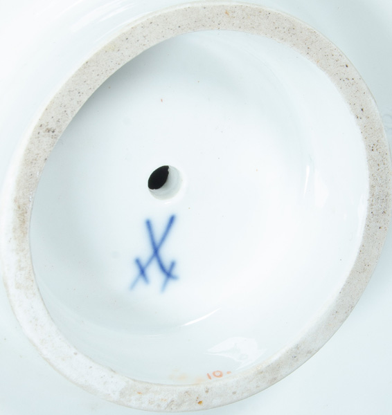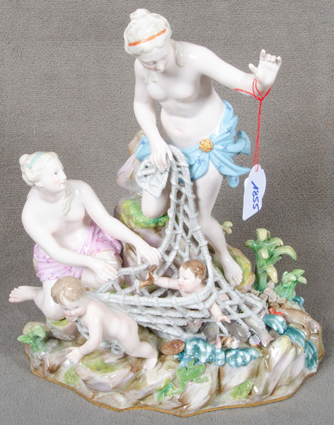 - Katalog-Nr: 1855Tritonenfang. Meissen 19. Jh. Porzellan, bunt bemalt; am Boden unterglasurblaue Schwertermarke, Formnummer „C35“, Modell nach Johann Carl Schönheit, H=32 cm.o.L.