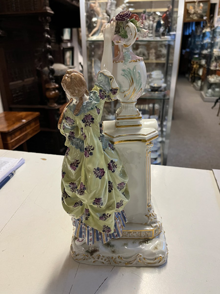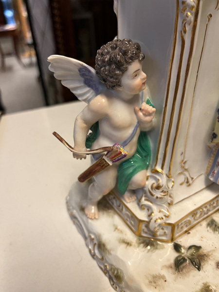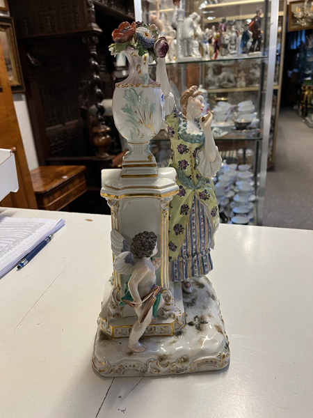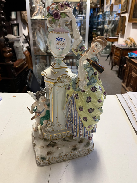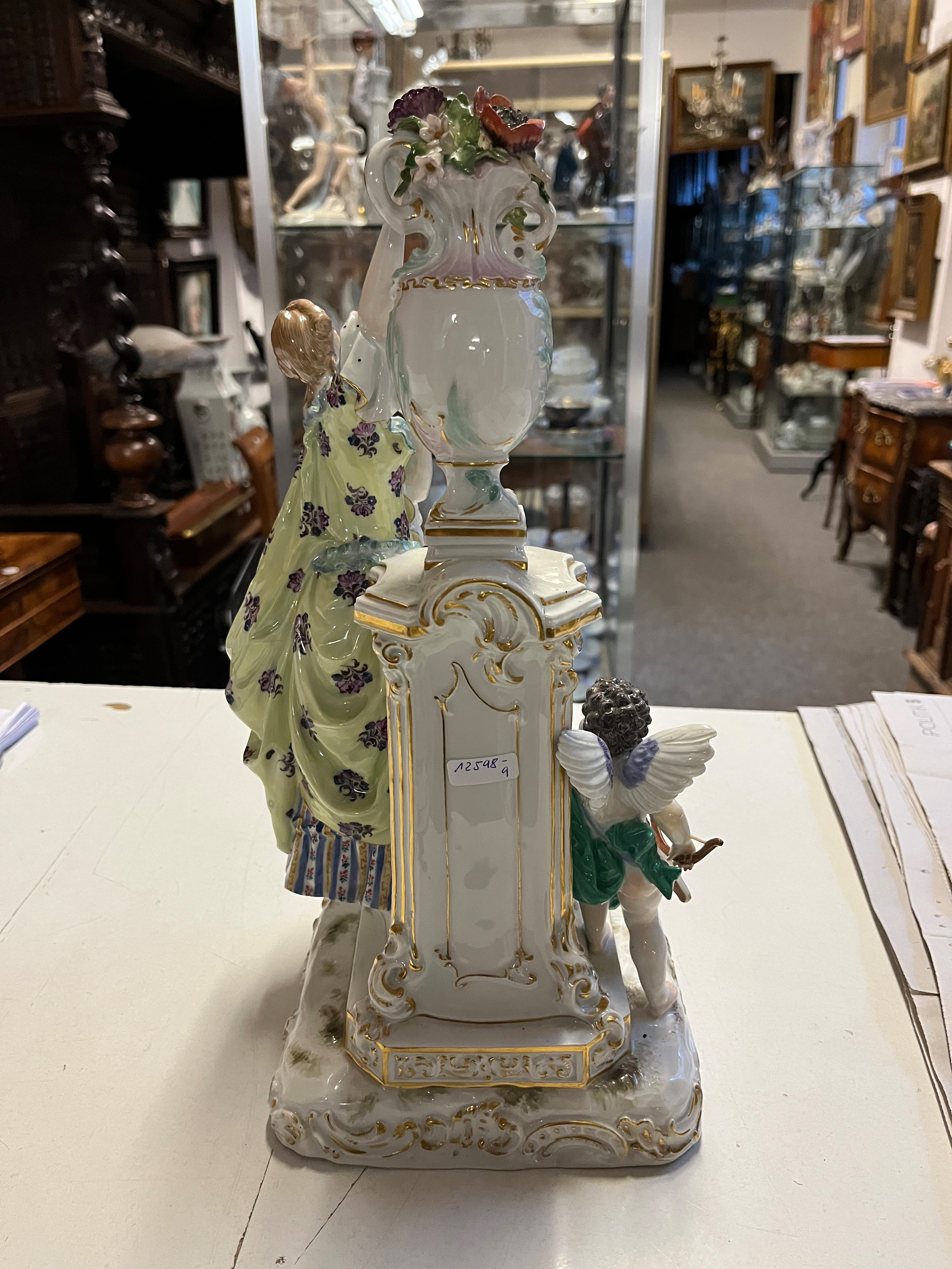 - Katalog-Nr: 1853Große Gruppe einer Dame mit Fächer und Amor. Meissen 20. Jh. Porzellan, aufwendig modelliert und staffiert; am Boden unterglasurblaue Schwertermarke, Formnummer „O180“, Staffiererziffer „10“, Modell von Friedrich Offermann, H=38 cm.o.L.