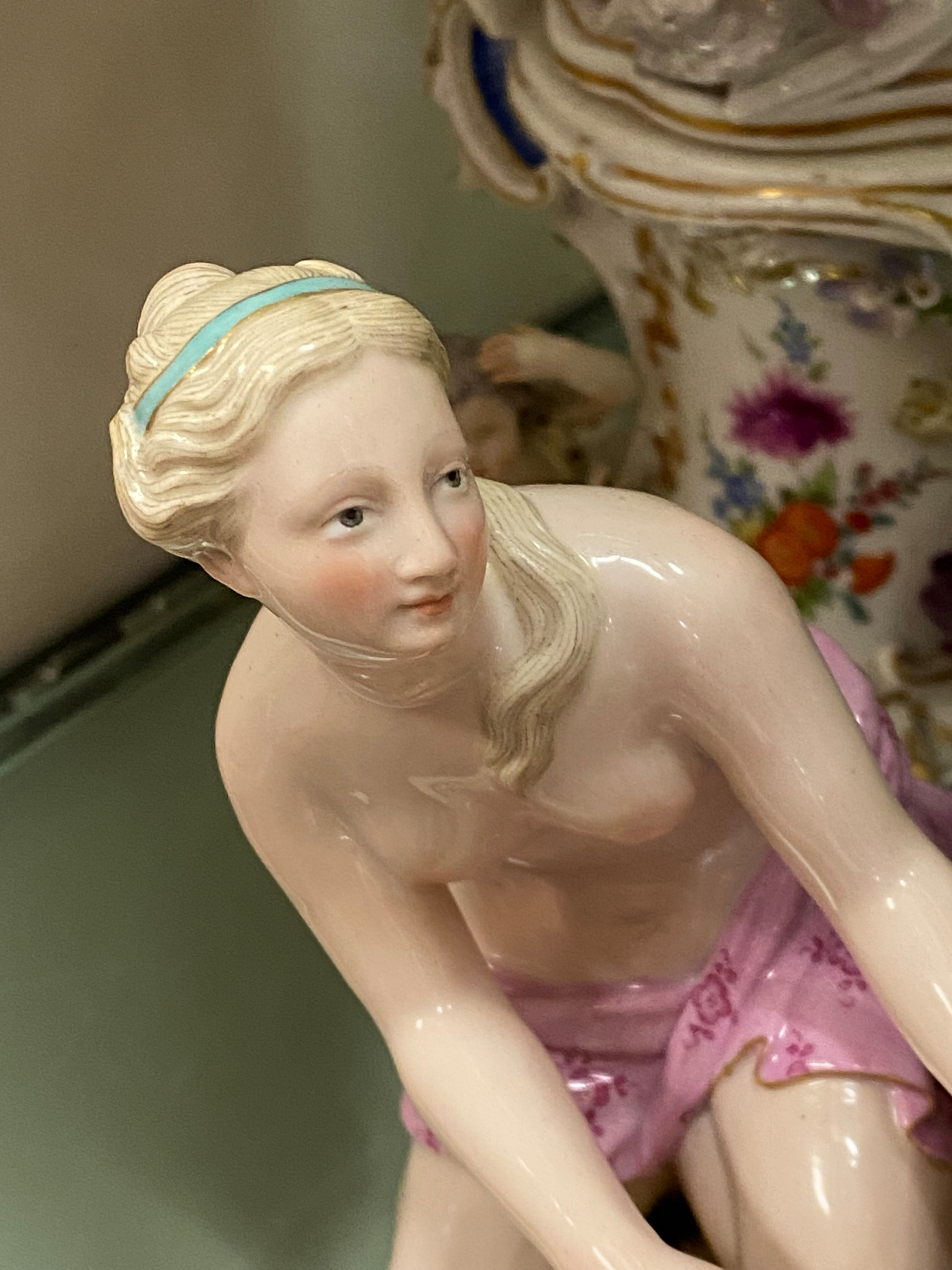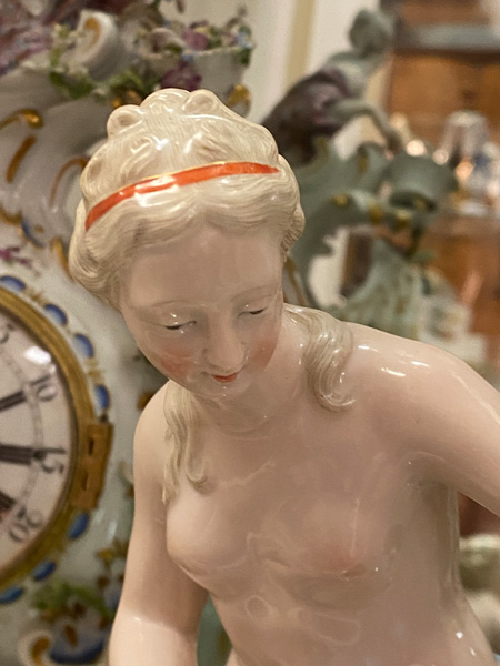 - Katalog-Nr: 1852„Der entdeckte Liebhaber“. Meissen 19. Jh. Porzellan, bunt bemalt; am Boden unterglasurblaue Schwertermarke, Formnummer „D.64“ , Staffiererziffer „32.“. Modell nach Johann Joachim Kaendler, H=12,5 cm.o.L.