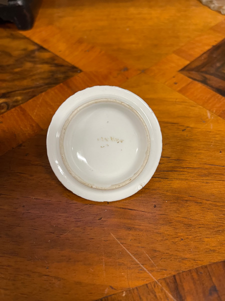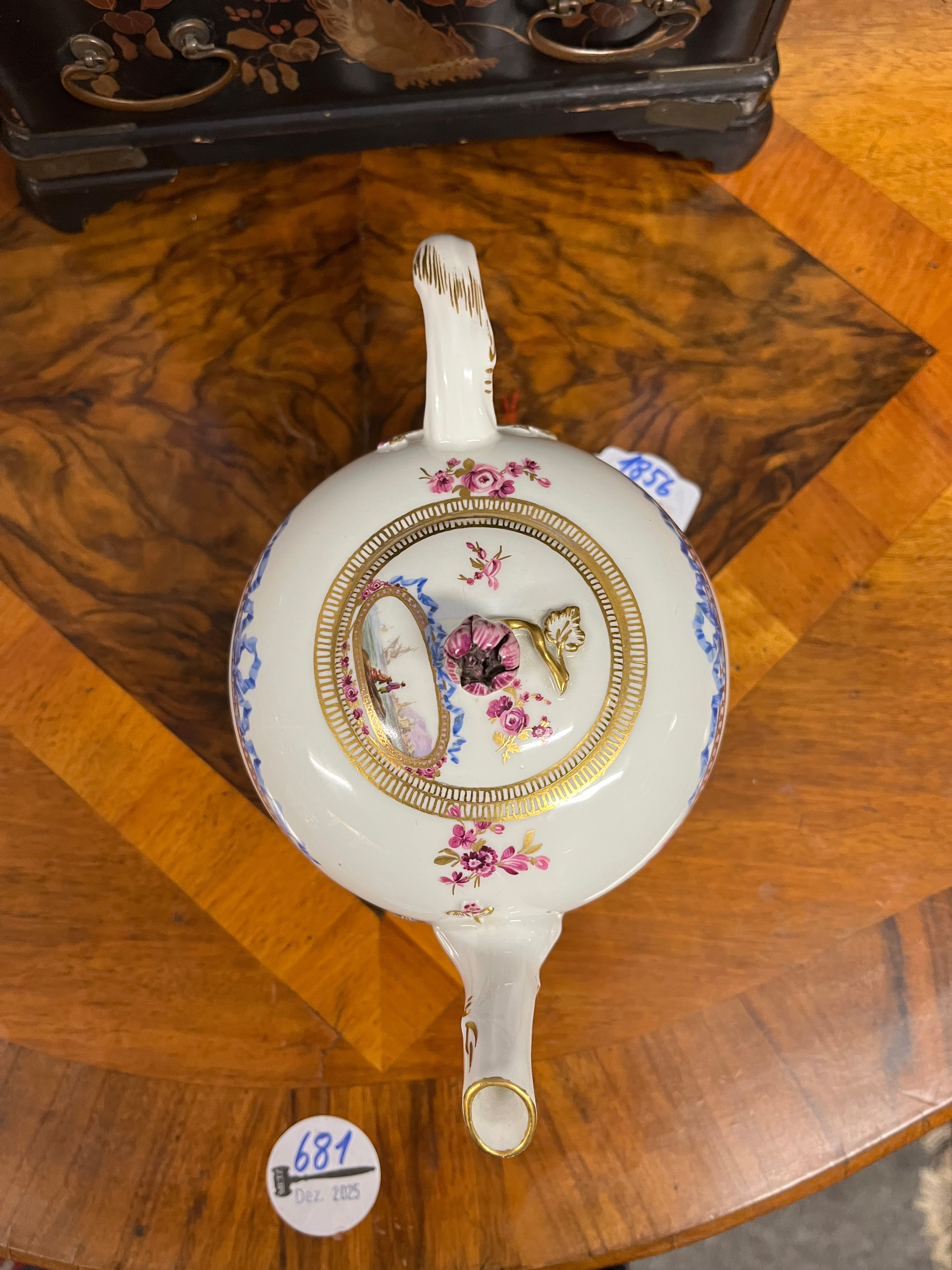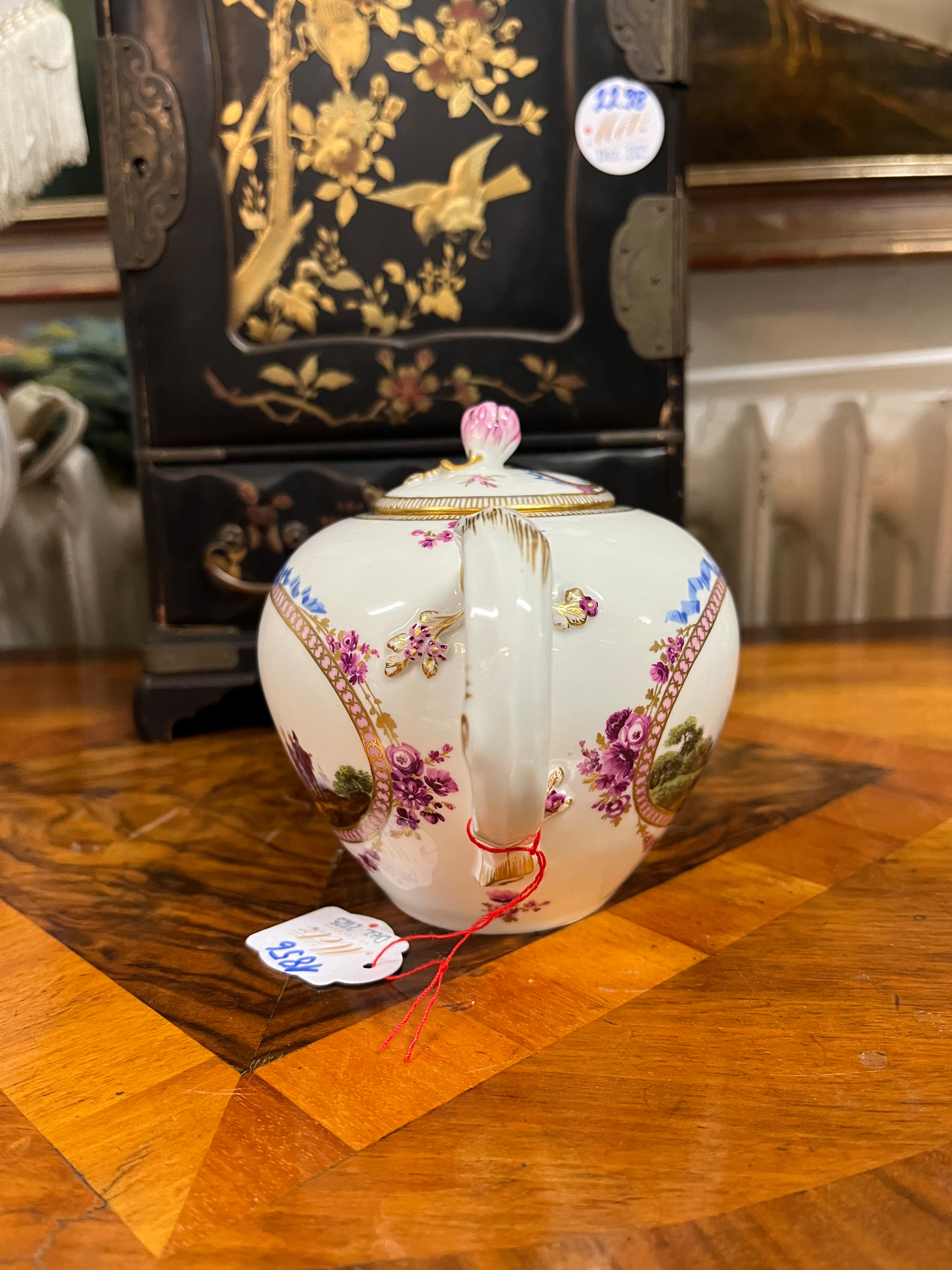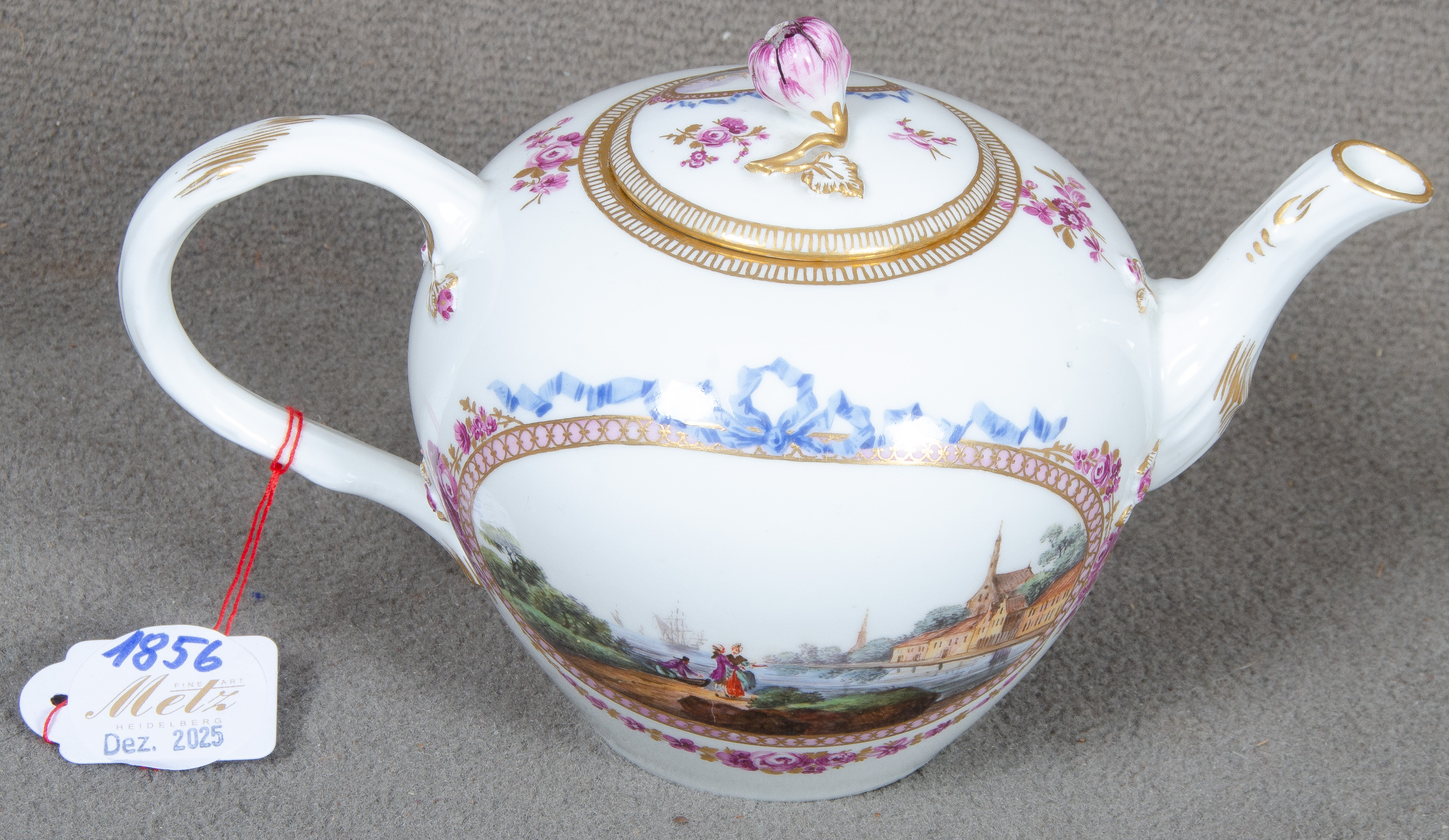 - Katalog-Nr: 1856Teekanne. Meissen-Marcolini 1774-1814. Porzellan, bunt bemalt mit Uferlandschaft, gold gesäumt sowie Ketten- und Floraldekor; Porzellan, am Boden unterglasurblaue Schwertermarke mit Stern, H=10,5 cm.o.L.