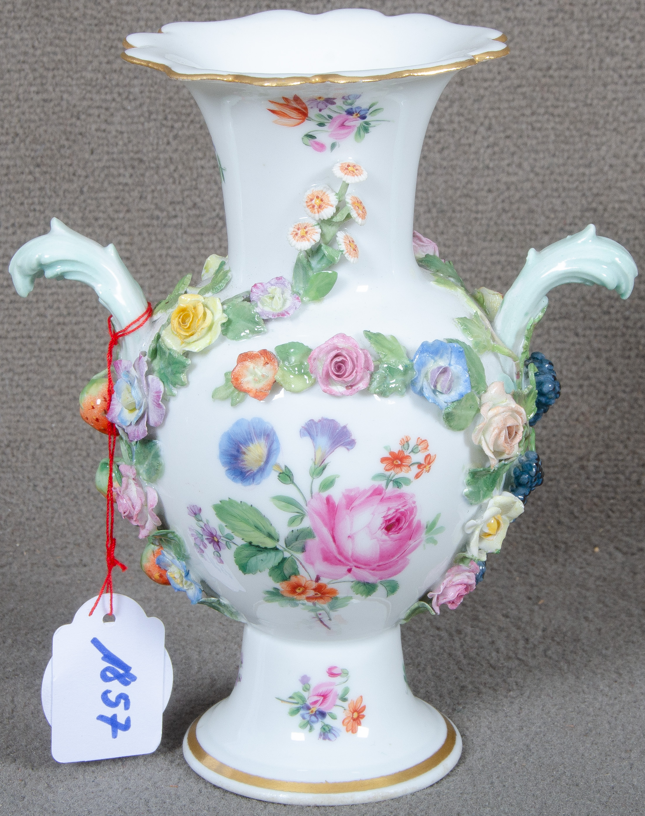 - Katalog-Nr: 1857Prunkvase. Meissen 19. Jh. Porzellan, aufwendig reliefiert mit Blüten und Blättern, Reserven bunt bemalt mit Watteauszenen und Blumenbouquets; am Boden unterglasurblaue Schwertermarke, D=16,2 cm. (min. rest.)o.L.