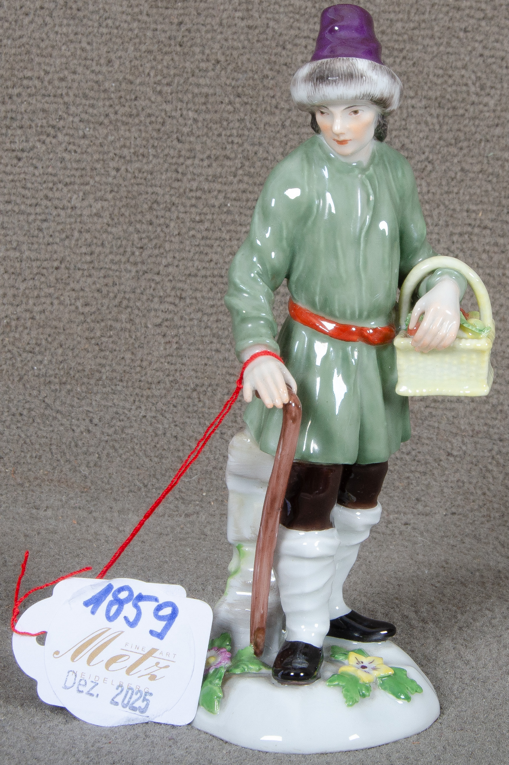 - Katalog-Nr: 1859Obstverkäufer aus der russ. Serie „Cris de Paris“. Meissen dat. 1910. Porzellan, bunt bemalt; am Boden unterglasurblaue Schwertermarke. Modell nach Peter Reinicke, H=15,3 cm.o.L.