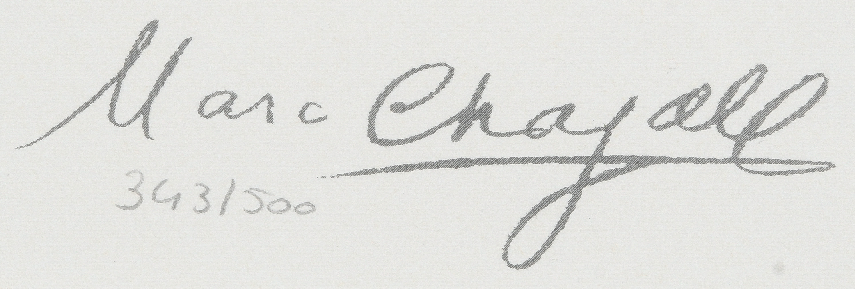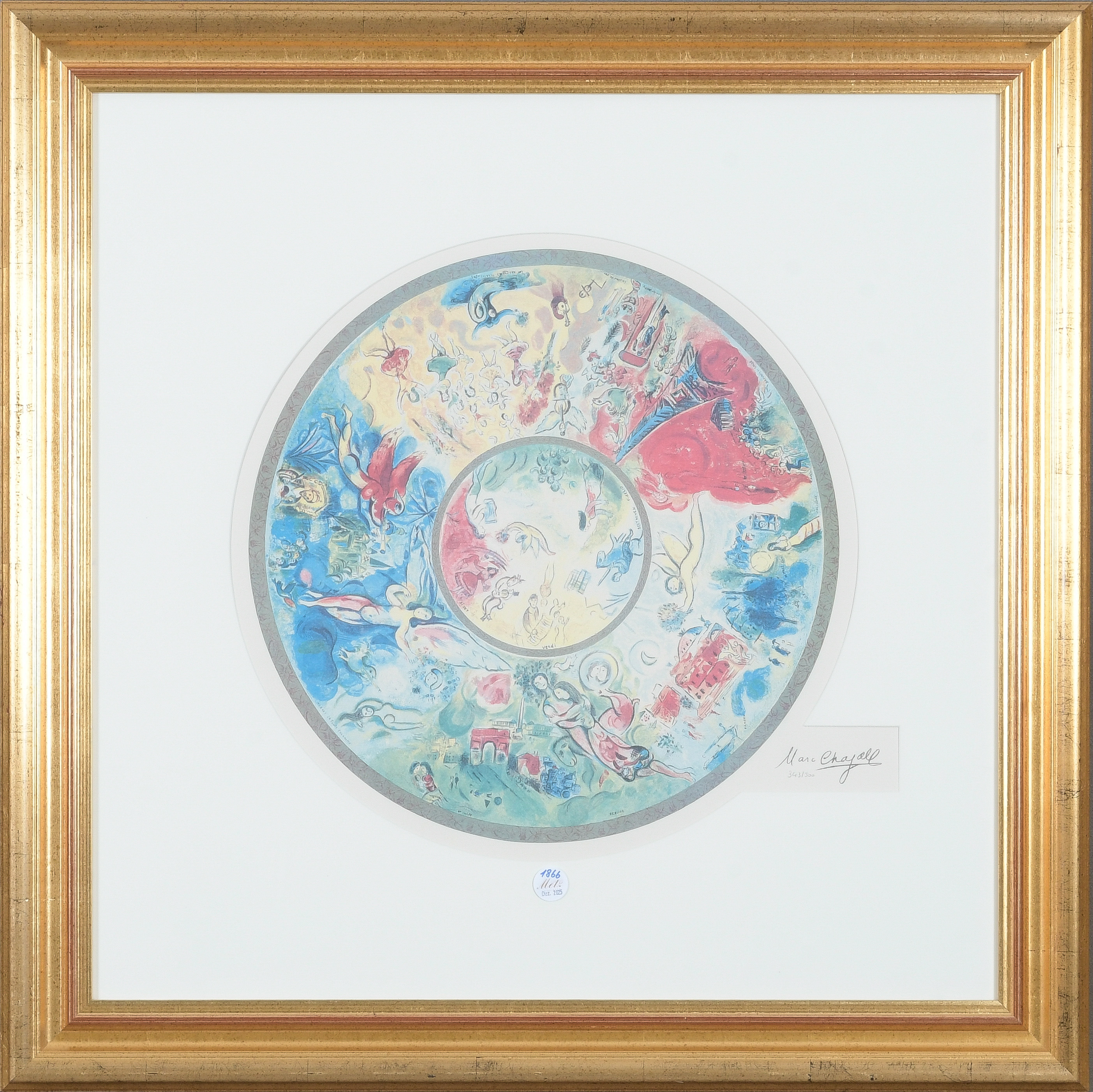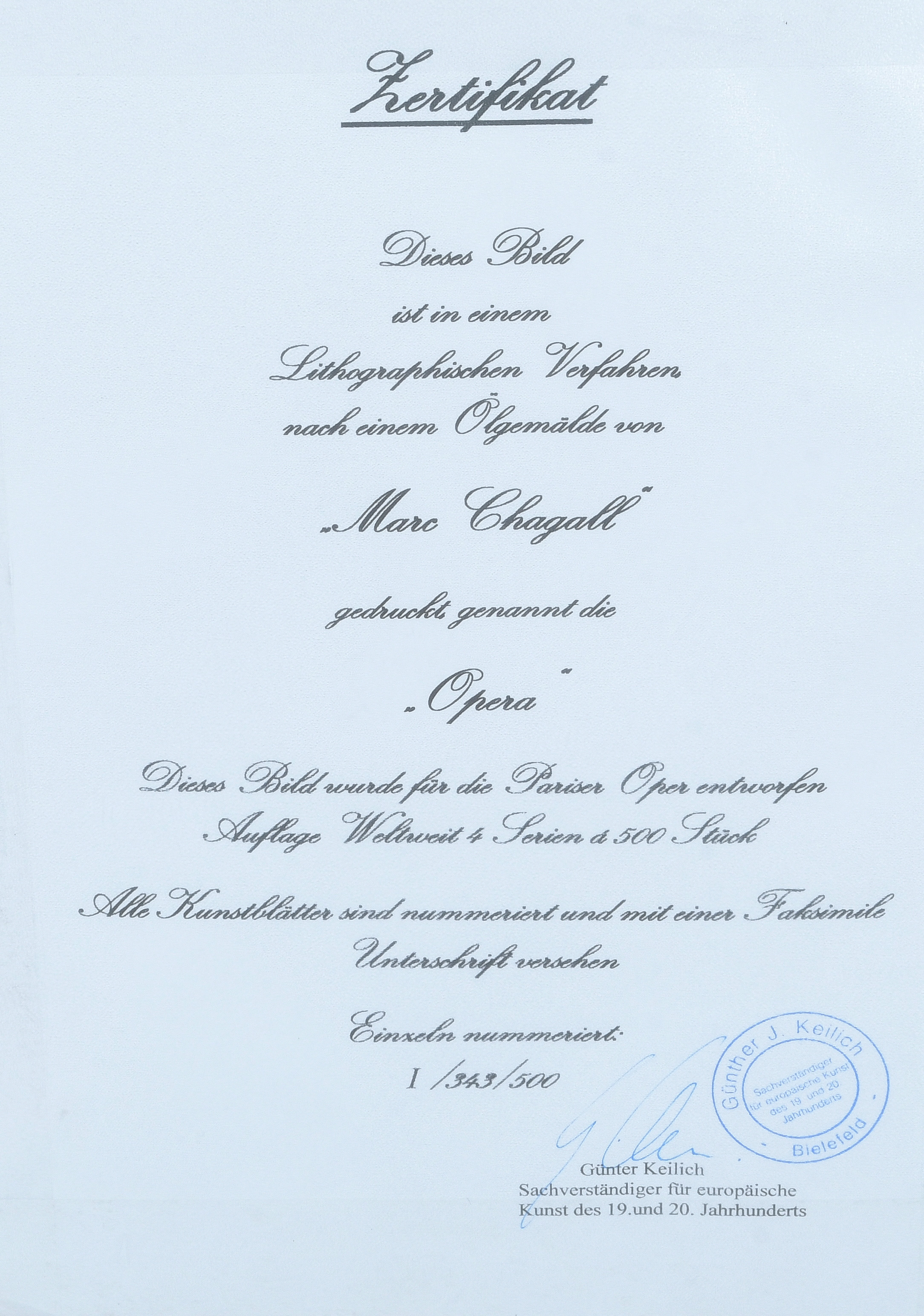 - Katalog-Nr: 1866Marc Chagall (1887-1985). „Opera“. Farblithographie 343/500, re./u./sign., mit Passepartout hi./Gl. gerahmt, D=51 cm. Mit Zertifikat von Günter Keilich.o.L.