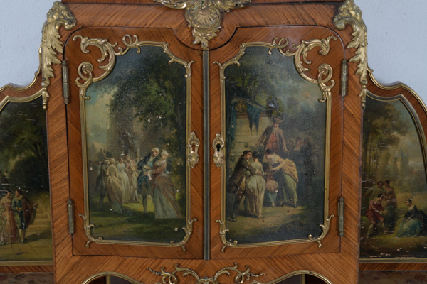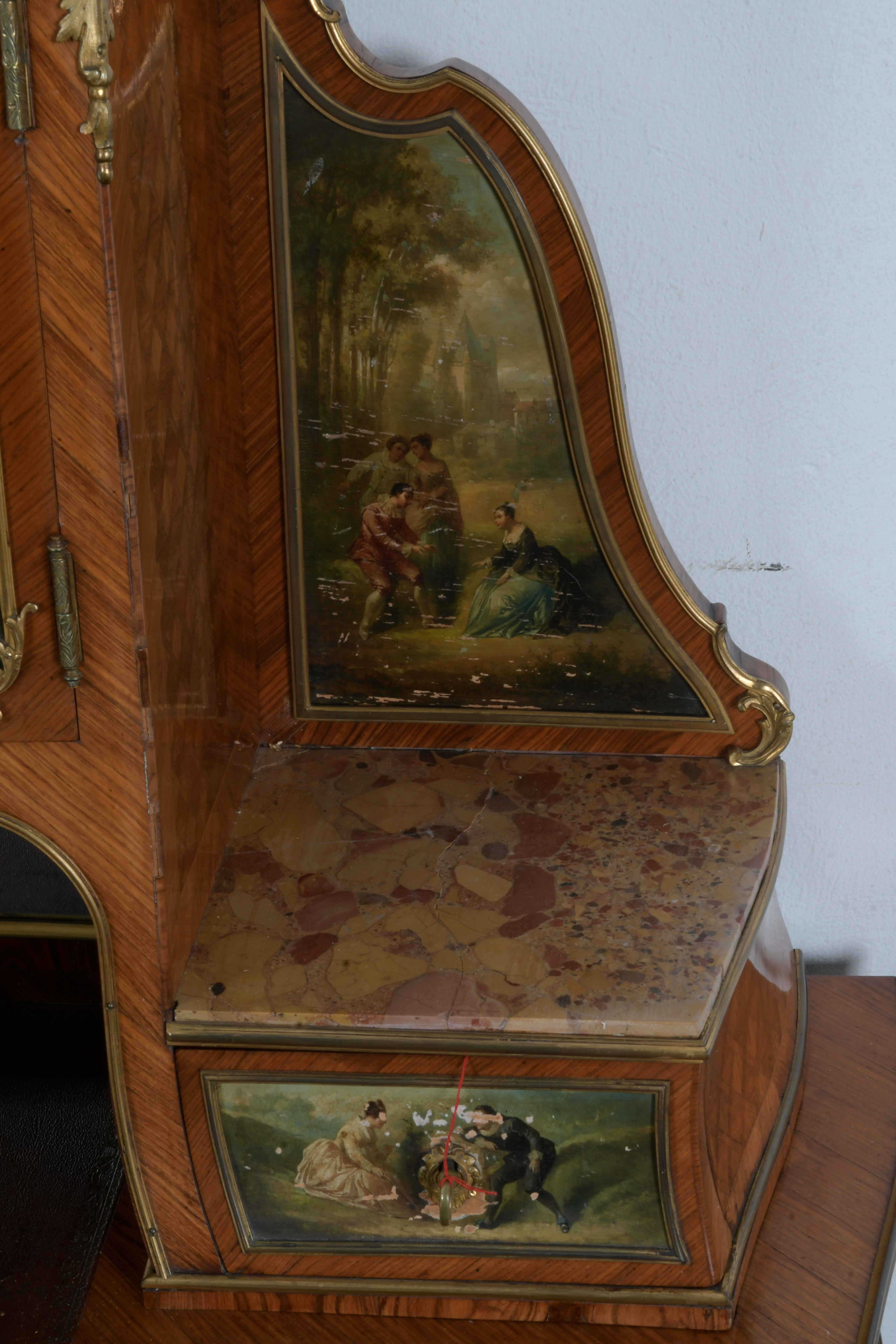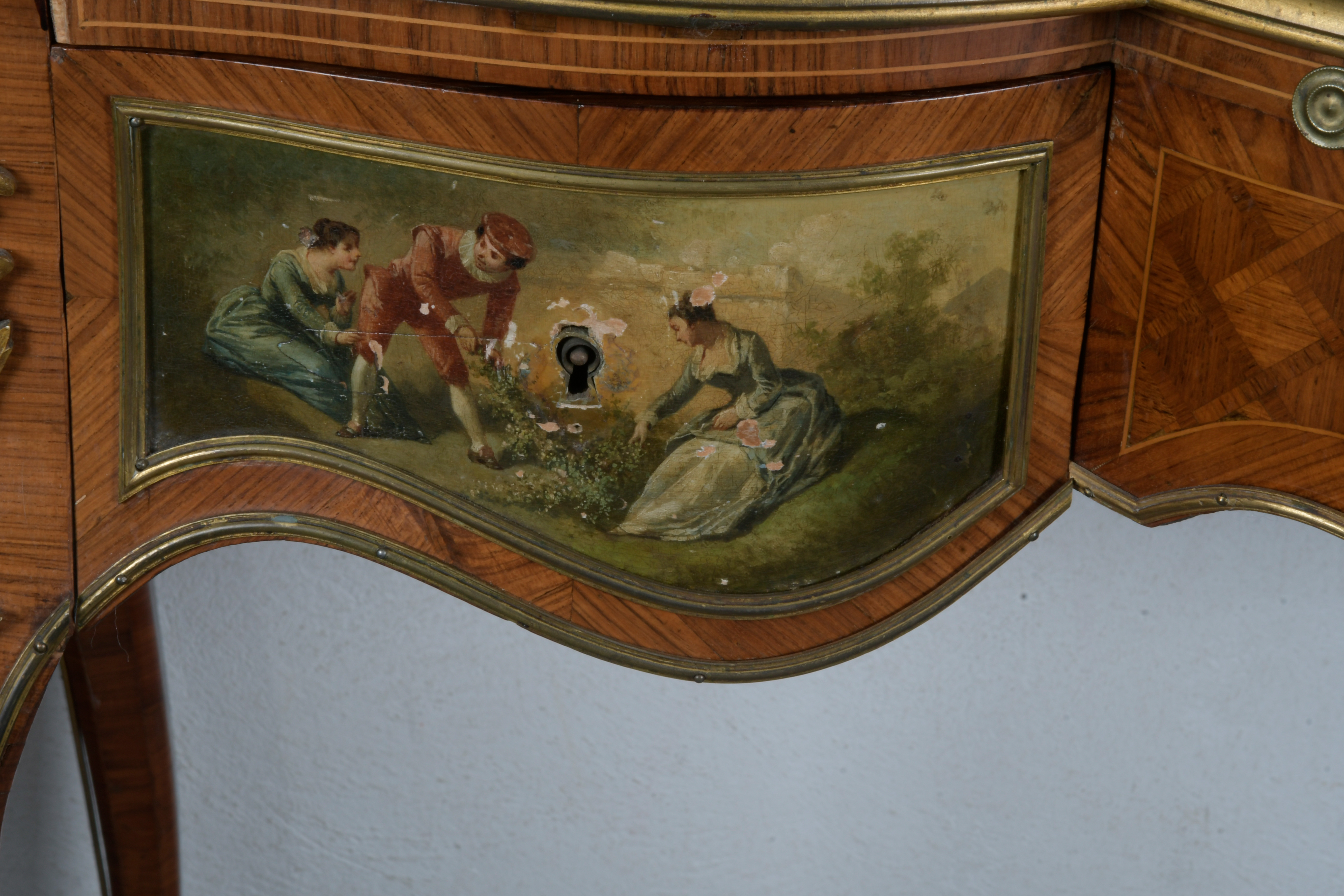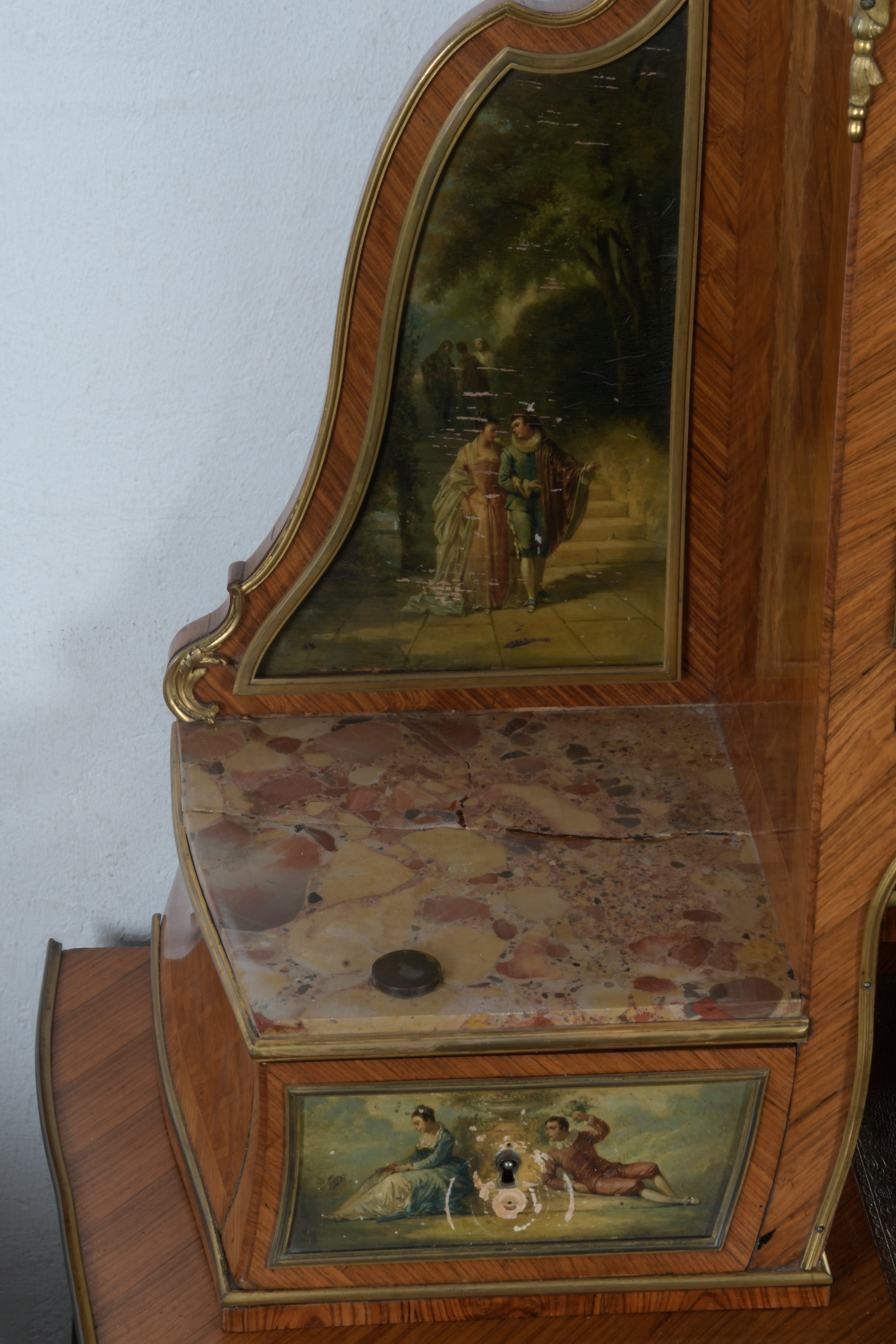 - Katalog-Nr: 1872Bonheur-du-Jour. Frankreich, wohl Werkstatt François Linke (1855-1946). Furniert mit verschiedenen Hölzern, marketiert mit Band-, Faden- und Würfeldekor, die Innenfelder bunt bemalt mit galanten Szenen, fein ausgeformte vergoldete Bronzebeschläge in Form von Akanthus, Maskaronen, Muscheln und Rocaillen; geschweifte Beine und Zarge, zweischübiger Tischkasten, allseits geschwungene Platte mit motivgeprägter Ledereinlage, herausziehbare Schreibplatte, ebenfalls mit Ledereinlage, zurückgesetzter, zweitüriger Kabinettaufsatz mit offenem Zwischenraum, Rückwand mit Facettspiegel, flankiert von je einem Schub, gekehlte, profilierte Abschlusskante mit eingelegter rot-weißer Marmorplatte, H=137 cm, B=96 cm, T=47 cm.o.L.