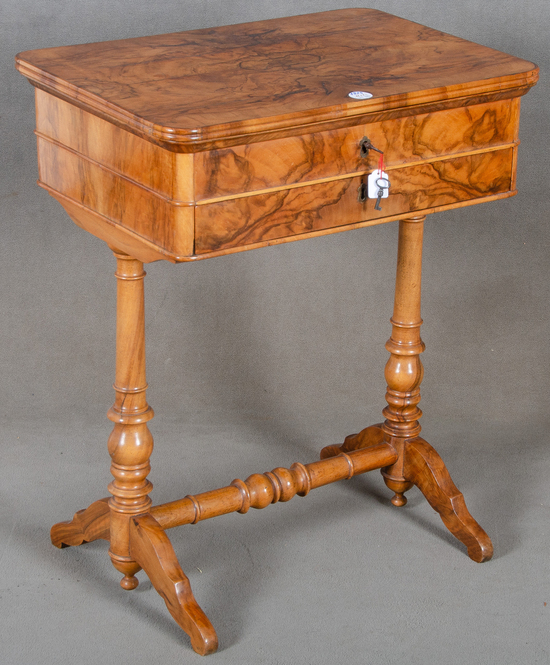 - Katalog-Nr: 1875Spätbiedermeier-Nähtisch. Deutsch 19. Jh. Nussbaum furniert, teilw. massiv und gedrechselt; Kufenfüße mit Mittelstab, darauf Säulen mit einschübigem Tischkasten, überstehende, profilierte, nach oben zu öffnende Platte mit darunter liegender Inneneinteilung, H=73,5 cm, B=60 cm, T=42 cm.o.L.