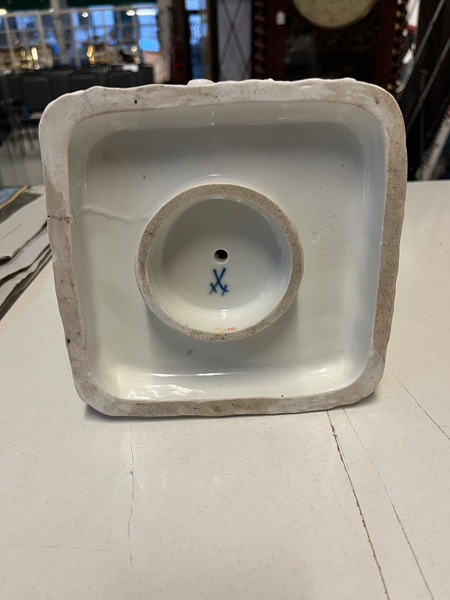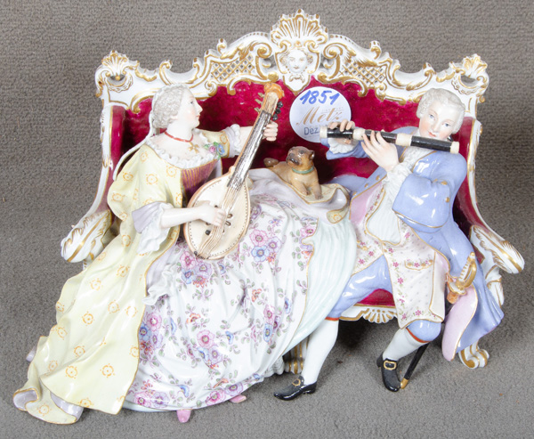 - Katalog-Nr: 1851Musizierendes Paar mit Mopshund. Meissen 19. Jh. Porzellan, bunt bemalt, mit Goldrand; am Boden unterglasurblaue Schwertermarke, Formnummer „W. 56“, Staffiererziffer „2.“, Modell nach Johann Joachim Kaendler, H=15,2 cm, B=19,5 cm, T=13 cm. (min. rest.)o.L.