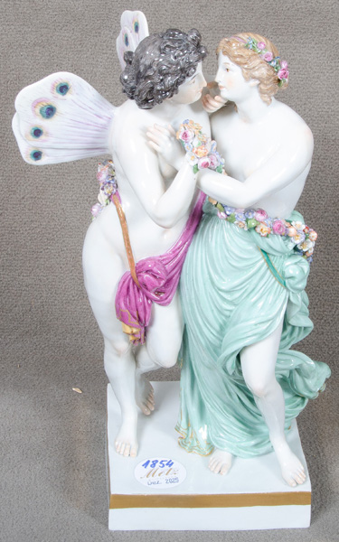 - Katalog-Nr: 1854Zephyr und Flora. Meissen Pfeifferzeit 1924–34. Porzellan, bunt bemalt; am Boden unterglasurblaue Schwertermarke mit Punkt, Formnummer „J10X“ , Staffiererziffer „24“, Modell von Christoph Gottlieb Jüchtzer, H=29,5 cm. (min. best.)o.L.