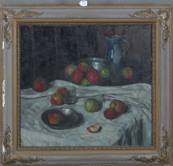 - Katalog-Nr: 1864Luise Kornsand (1876-1962). Stillleben mit Obst, Zinnteller und -schale, Glasbecher und Steinzeugkrug. Öl/Lw., li./u./sign./dat. 1920, gerahmt, 62 x 66 cm. (Rahmen besch.)o.L.