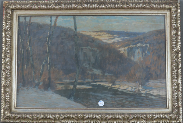- Katalog-Nr: 1865Maler des 20. Jh. Winterlandschaft mit Flusslauf und Bergen. Öl/Malkarton, re./u. unleserlich sign., hi./Gl. gerahmt, 50,5 x 79,5 cm.o.L.