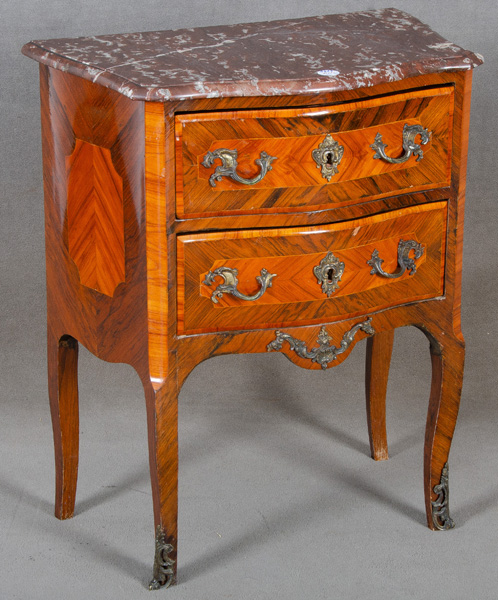 - Katalog-Nr: 1873Kommode. Frankreich 19. Jh. Mit verschiedenen Hölzern furniert; geschweifte Beine und Zarge, zweischübig, leicht gebaucht, abgeschrägte Kanten, überstehende, profilierte rot-weiße Marmorplatte, H=74 cm, B=61 cm, T=36 cm.o.L.