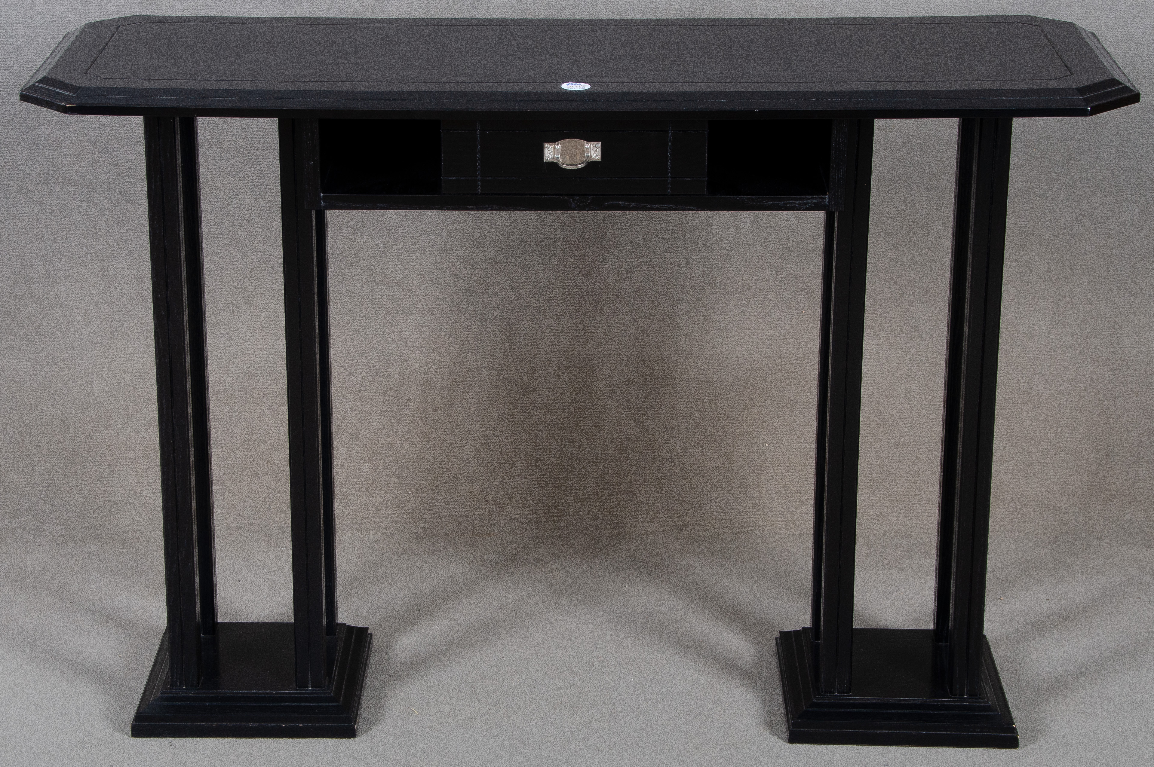 - Katalog-Nr: 1876Konsole. Italien, Selva 20. Jh. Massivholz, schwarz lackiert; acht Säulen auf zwei quadratischen Fußplatten, einschübiger Tischkasten, an der Innenseite des Schubes Metallschild mit Firmenlogo, überstehende, profilierte, rechteckige Platte mit abgeschrägte Kanten, H=77 cm, B=116 cm, T=41 cm.o.L.