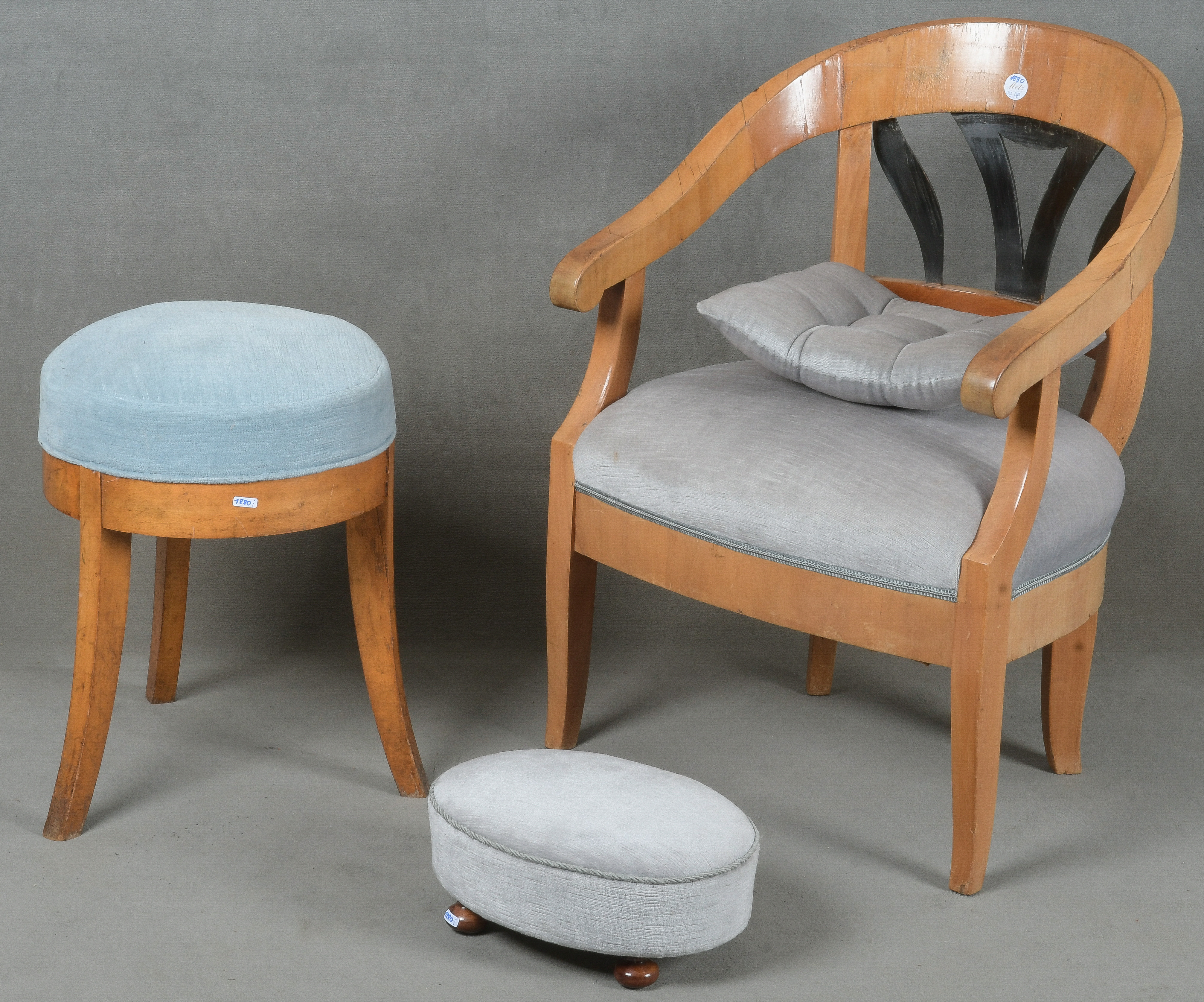 - Katalog-Nr: 1880Halbrunder Biedermeier-Schalensessel, -Hocker und -Fußschemel. Deutsch 19. Jh. Kirschbaum furniert, teilw. massiv; Säbelbeine, durchbrochene Fächerlehne, teilw. ebonisiert.o.L.