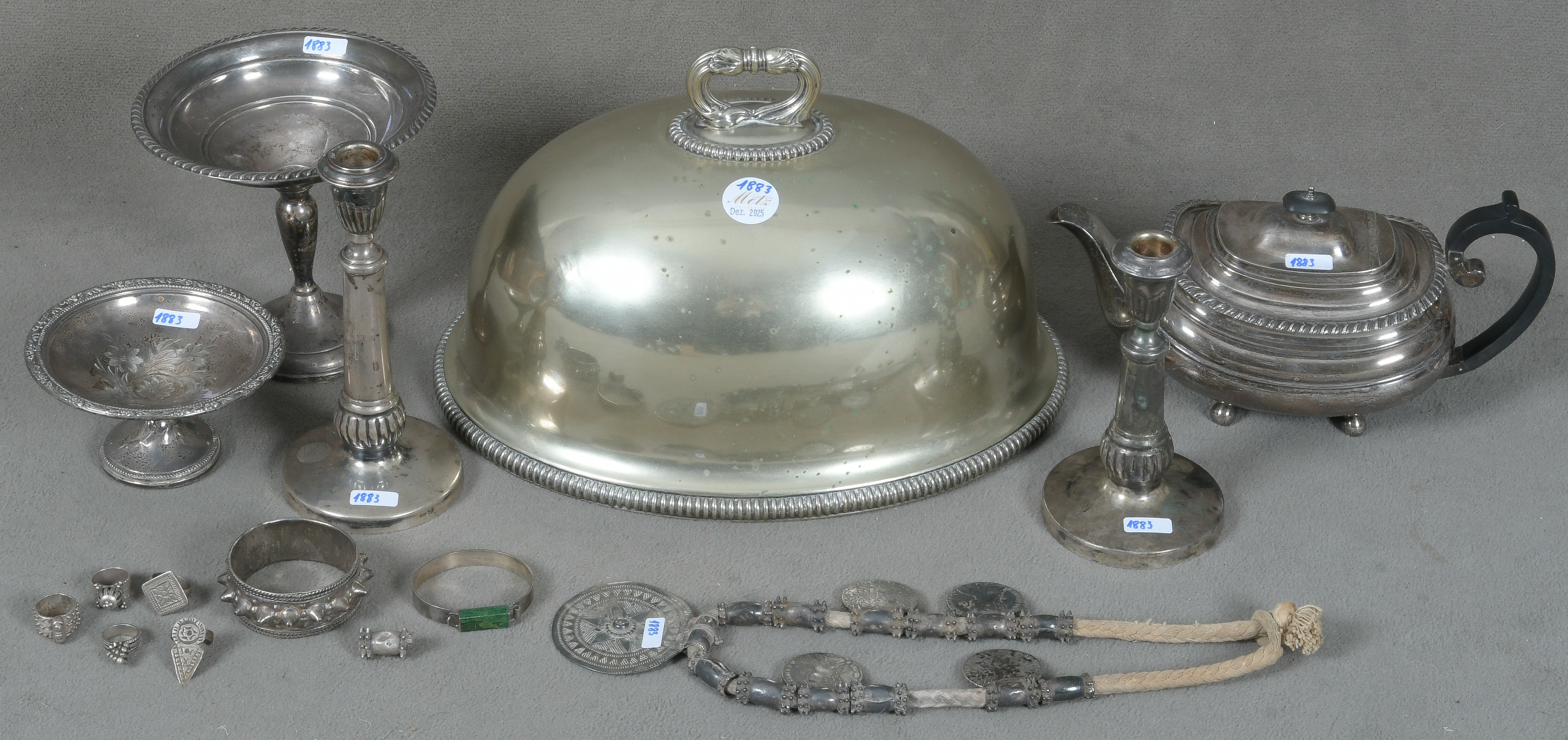 - Katalog-Nr: 1883Konvolut Silber, ca. 1.480 g / Versilbertes, u.a. Glocke, Fußschalen, Kanne, Leuchter und orientalischer Schmuck, H=2,5 bis 24 cm.o.L.