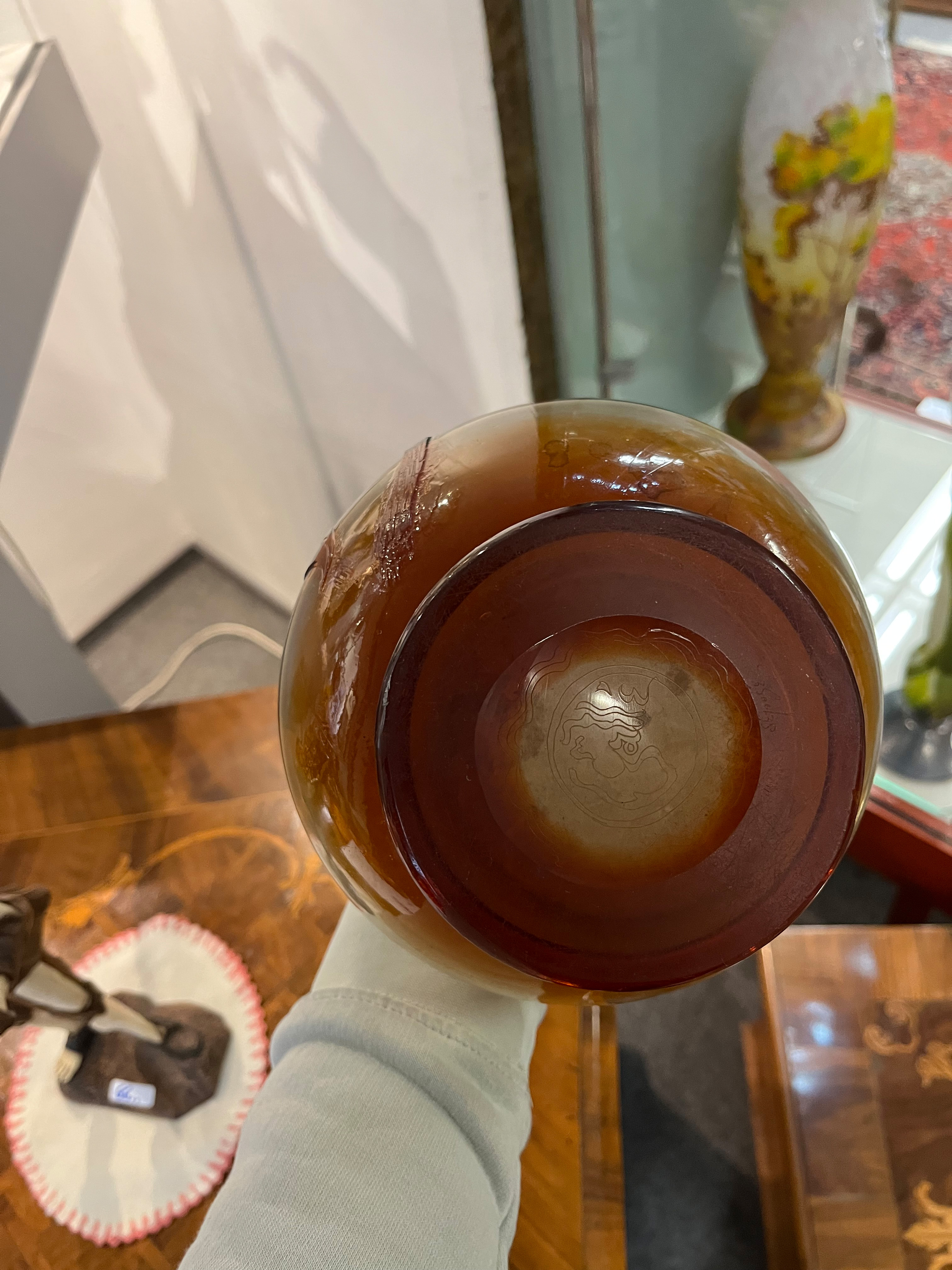 - Katalog-Nr: 1900Jugendstil-Vase. Nancy, Émile Gallé um 1900. Farbloses Glas, farbig überfangen, umlaufend floral geschnitten und feuerpoliert; an der Wandung sign., H=35,5 cm.o.L.