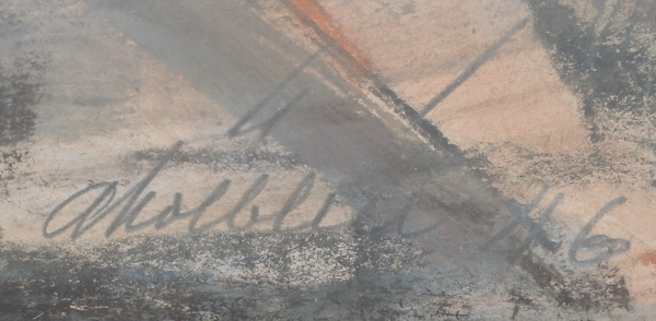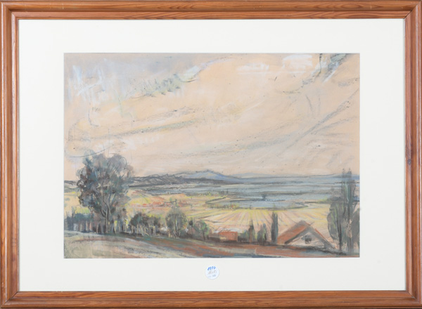 - Katalog-Nr: 1877Albin Kölblin (1896-1963). Landschaft mit Bäumen, Gebäuden und See. Mischtechnik, re./u./sign./dat. (19)46, mit Passepartout hi./Gl. gerahmt, 46,5 x 64,5 cm.o.L.