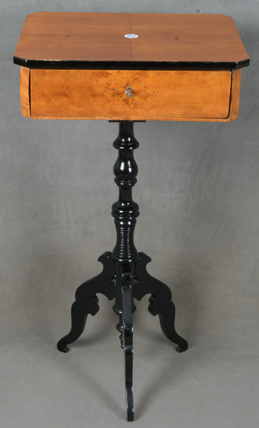 - Katalog-Nr: 1881Spätbiedermeier-Nähtisch. Deutsch 19. Jh. Ahorn furniert, teilw. massiv und schwarz lackiert; dreipassiger Fuß mit gedrechselter Mittelsäule, einschübiger Tischkasten mit abgeschrägten Kanten, Inneneinteilung und überstehender Platte, H=88 cm, B=48 cm, T=38 cm.o.L.