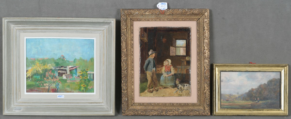 - Katalog-Nr: 1885Sepp (Josef) Georg Eringer (1879-1931). Landschaft mit Personenstaffage. Öl/Holz, re./u./sign., gerahmt, 15 x 24 cm; dazu Maler des 20. Jhs. Zimmerinterieur und Landschaft. Öl/Lw., aufgezogen, li./u./sign., gerahmt, 26,5 x 20 cm.o.L.