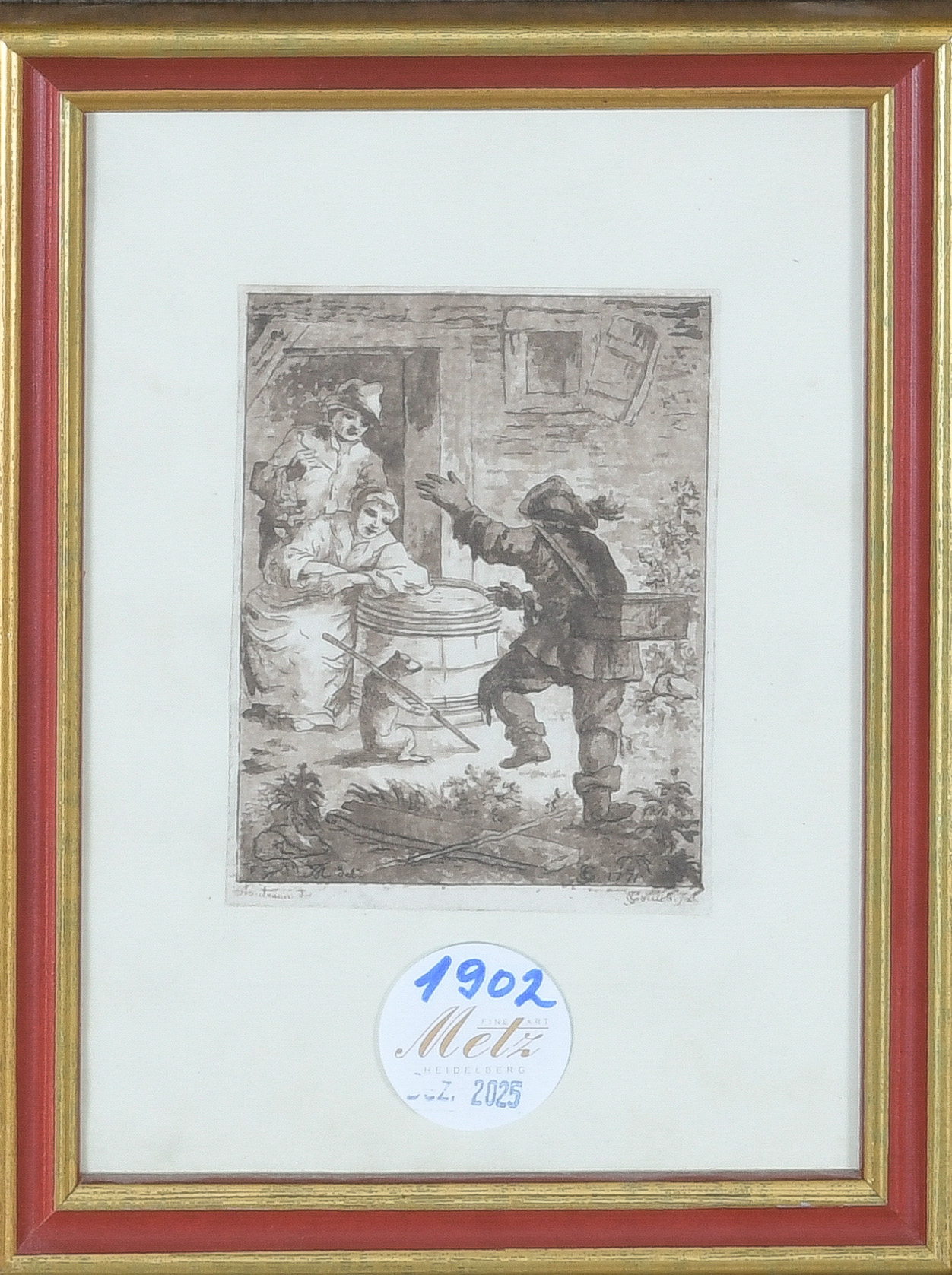 - Katalog-Nr: 1902Ernst Gottlob (1744-1792). Personen und Tiere vor Gebäude. Tuschfederzeichnung, braun laviert, re./u./sign., hi./Gl. gerahmt, 9,5 x 7 cm.o.L.