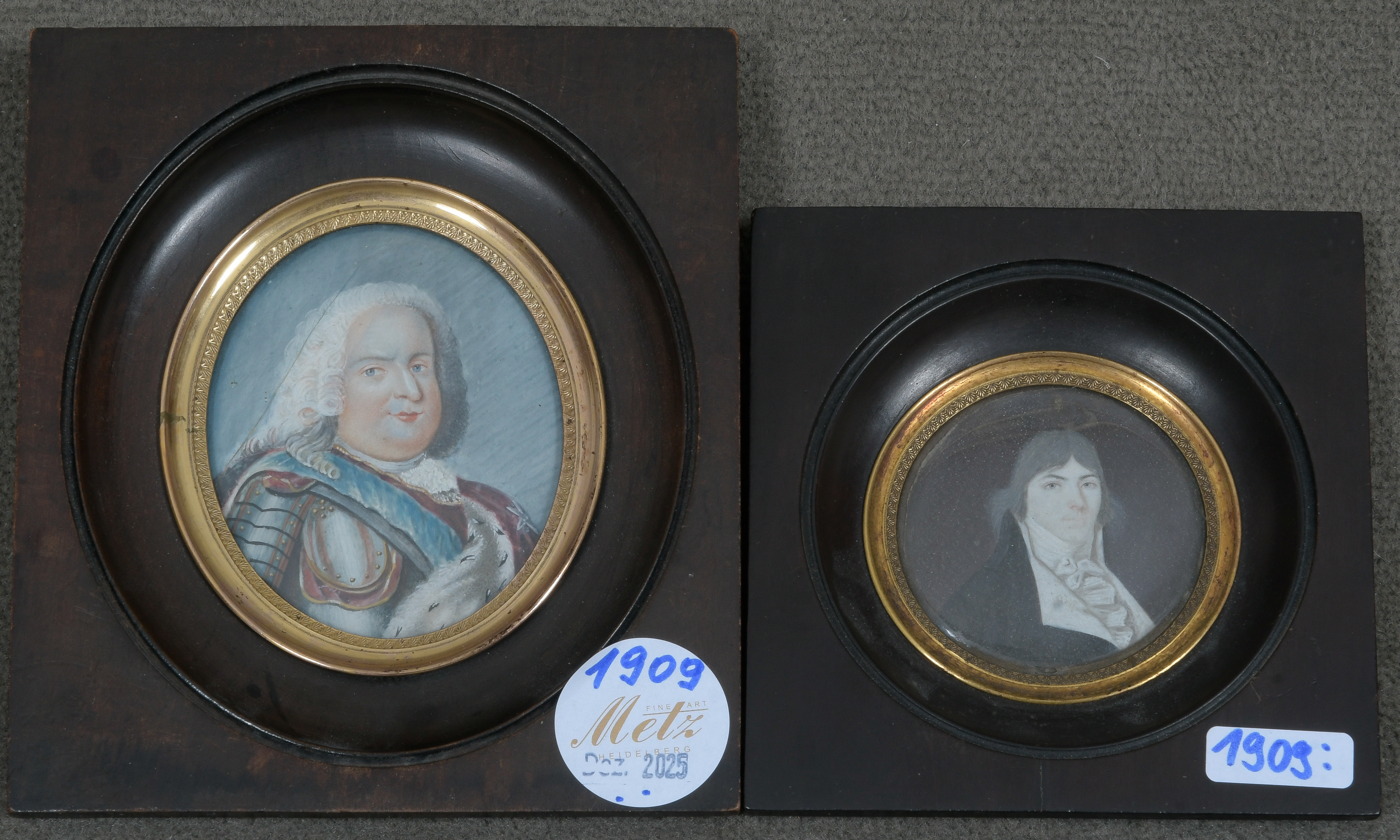 - Katalog-Nr: 1909Wohl deutscher Miniaturist des 18./19. Jhs. Porträt von Stanislaus Lesczynski, König von Polen und weiteres Herrenporträt, je hi./Gl. gerahmt, 8 x 6 cm / D=6 cm.o.L.