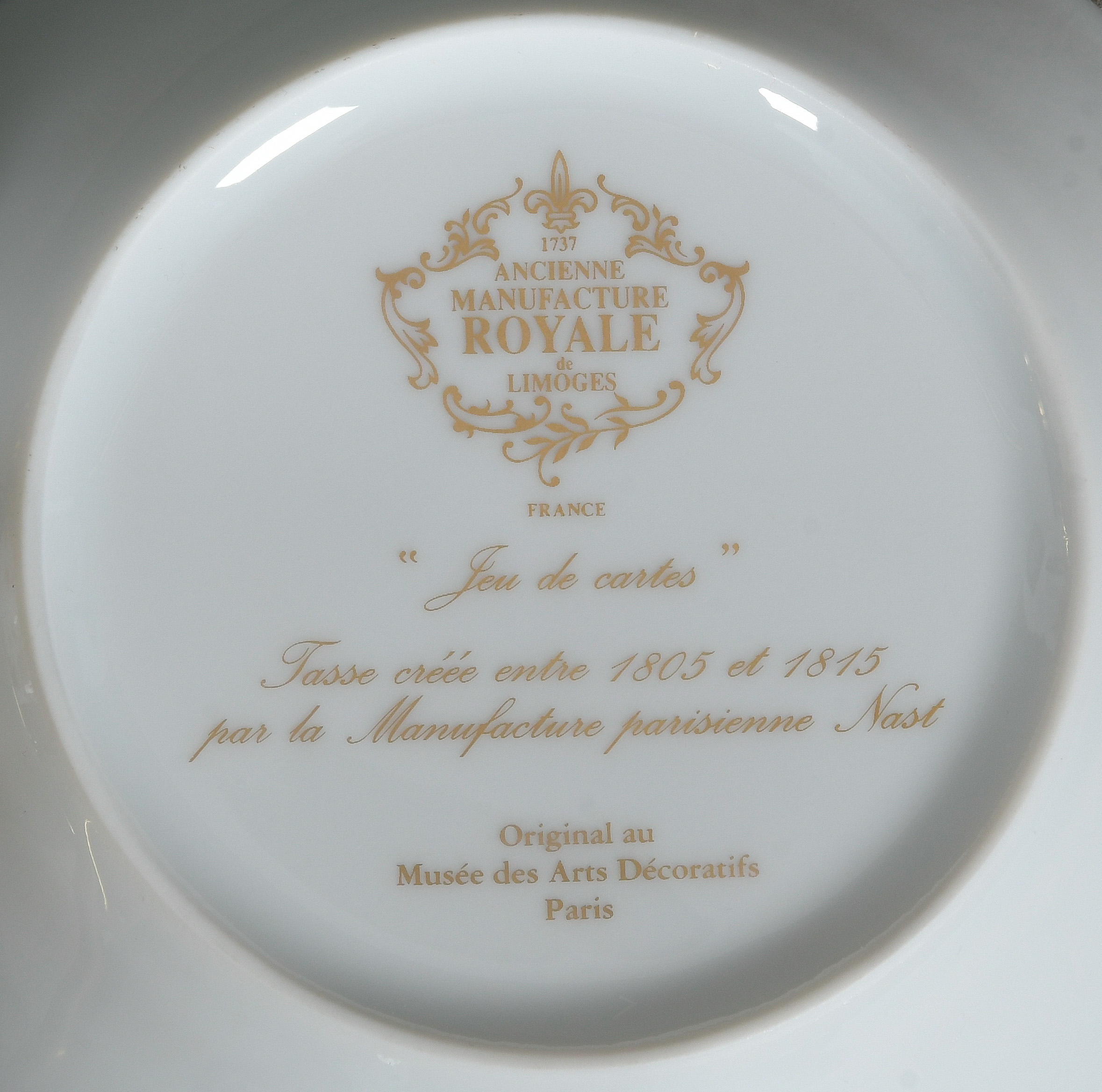 - Katalog-Nr: 1912Vier Tassen mit Unterschalen „Jeu de Cartes“. Limoges 20. Jh. Porzellan, bunt dekoriert; am Boden gemarkt; dazu Tischdecke mit Spielkartendekor, 144 x 180 cm.o.L.