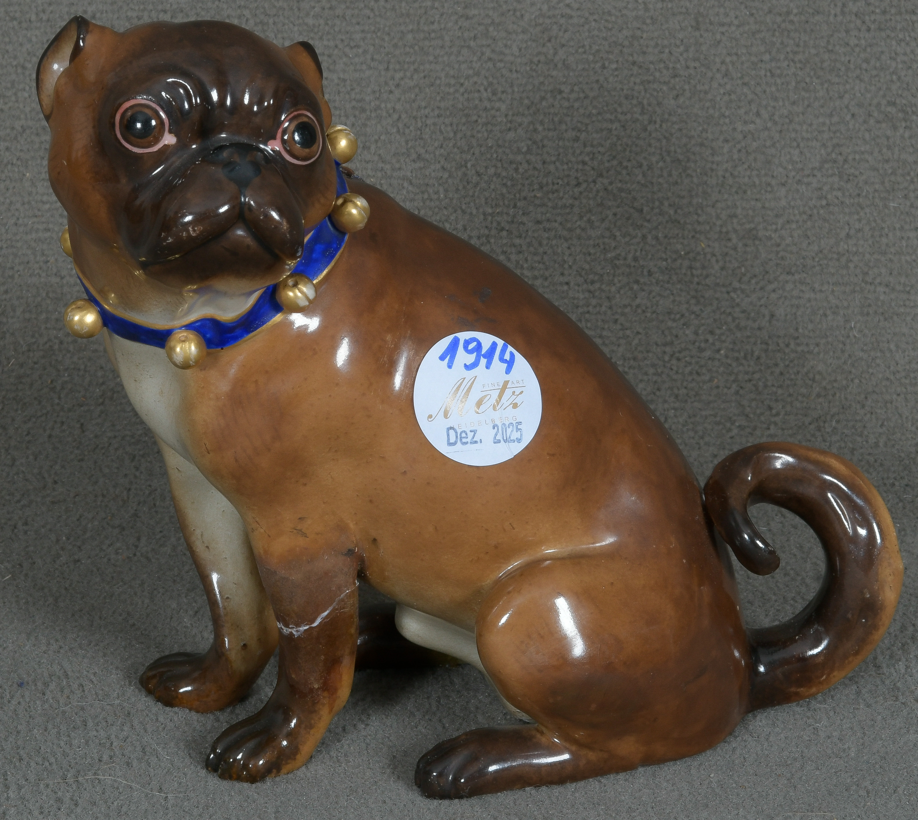 - Katalog-Nr: 1914Sitzender Mops. Meissen 19. Jh. Porzellan, bunt bemalt., H=18 cm. (besch.)o.L.