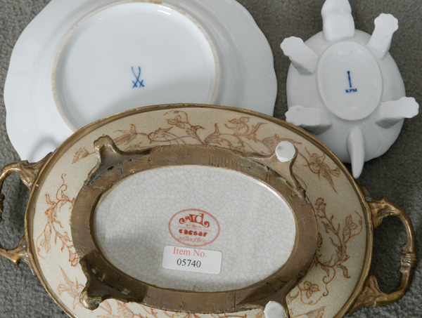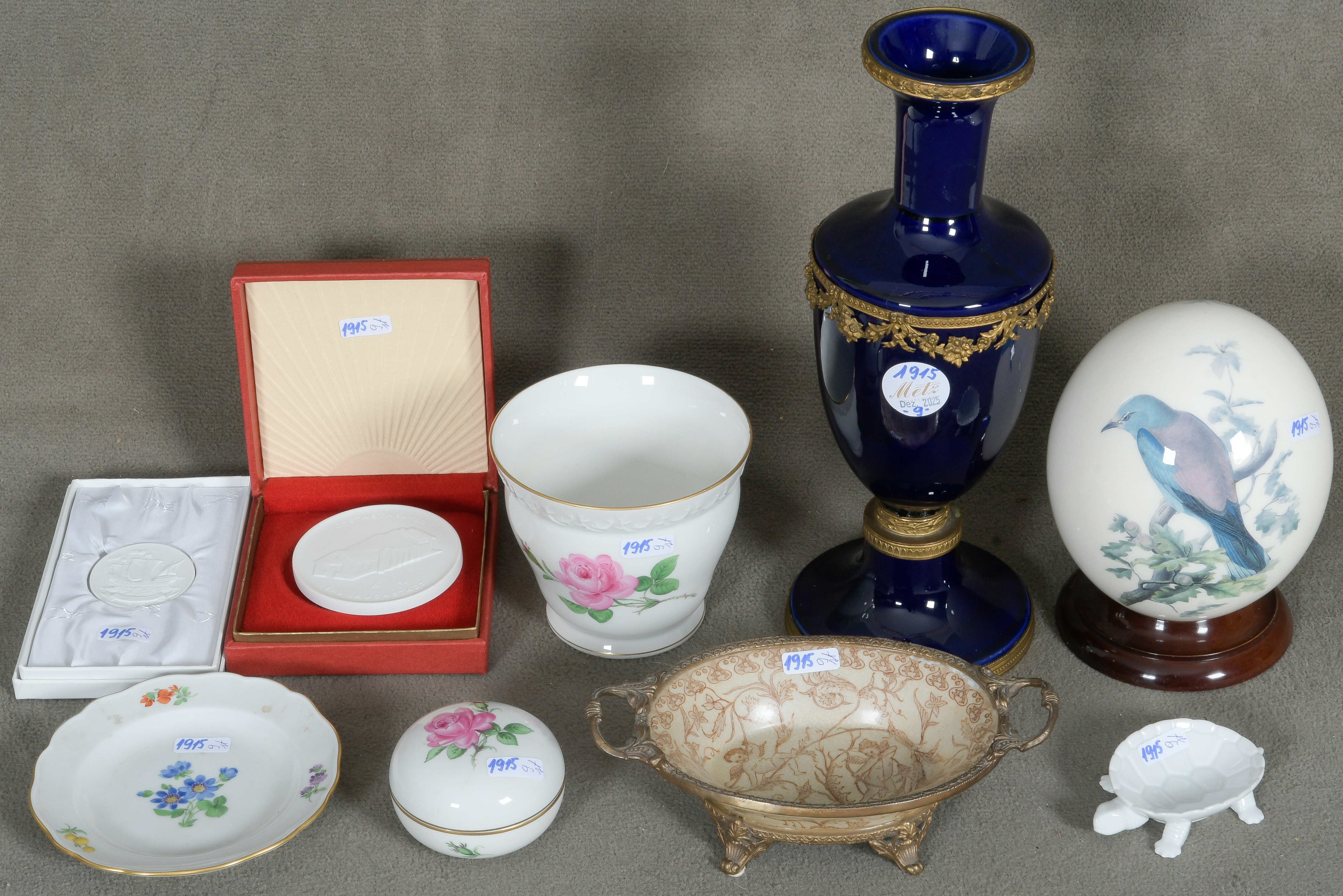 - Katalog-Nr: 1915Konvolut unterschiedlicher Formteile, u.a. Berlin / Meissen 19./20. Jh. Porzellan, teilw. bunt bemalt mit „Rote Rose“ und Feldblumen. Bestehend aus: Zwei Bisquitporzellan-Gedenkmedaillen im Etui, ein Beilageteller (D=14 cm), eine Deckeldose (H=5 cm, D=7,5 cm), eine Vase (H=10 cm), eine Schildkröte (Berlin), eine Henkelschale mit Messingmontur, ein Zierei auf Holzsockel und eine Ziervase, H=6 bis 31 cm.o.L.